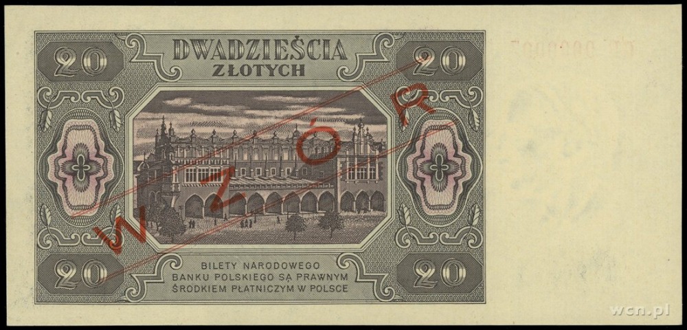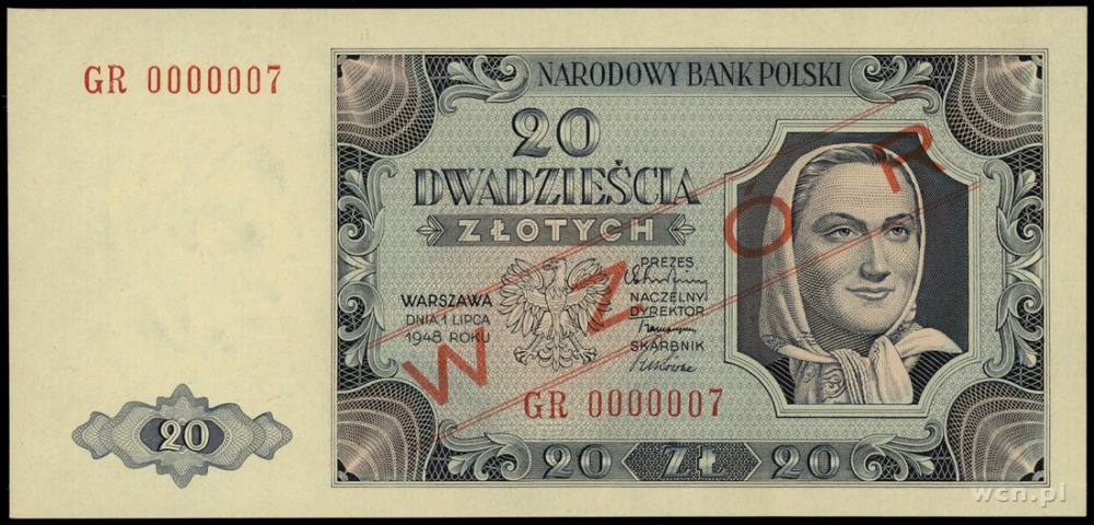 Polska powojenna 1944-1952, 20 złotych 1.07.1948, seria Gu, numeracja 0000009, po obu stronach ukośny czerwony nadruk WZÓR; Lucow 1266 (R4), Miłczak 137Wl; lekko ugięty róg, ale pięknie zachowane, wzór Jaroszewicza