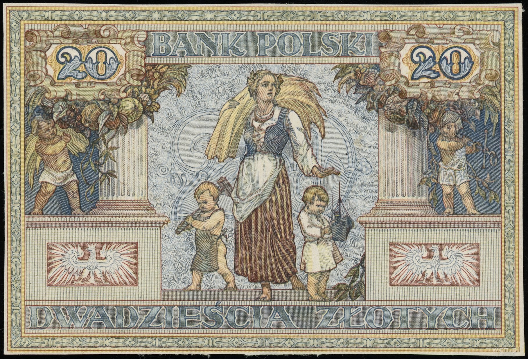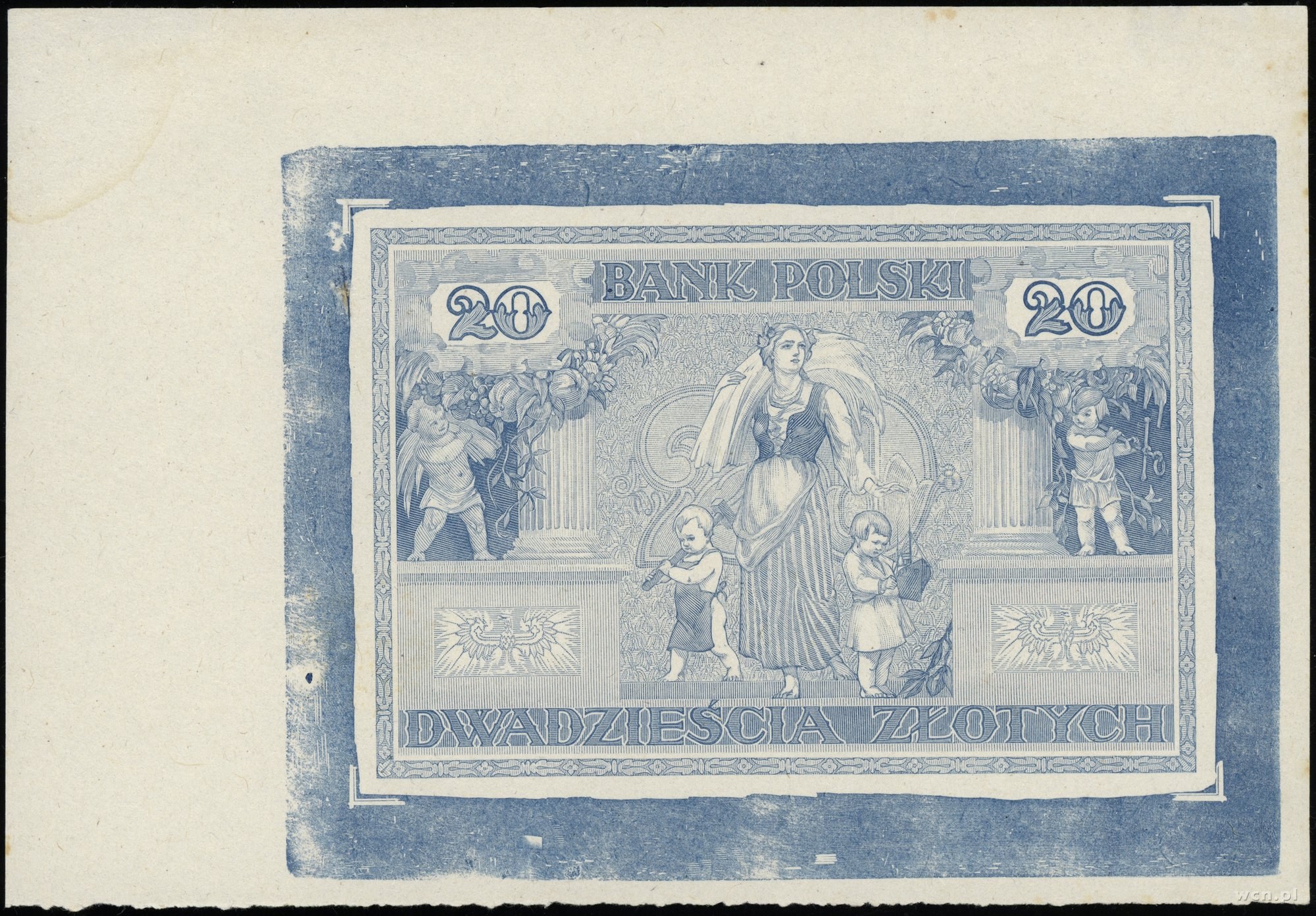 emisje po reformie Władysława Grabskiego, 20 złotych, 1931; 5 odbitek technologicznych z różnych faz projektowych banknotu 20 złotych z datą emisji 20.06.1931; Lucow - (patrz 666), Miłczak - (patrz 72); duża rzadkość.