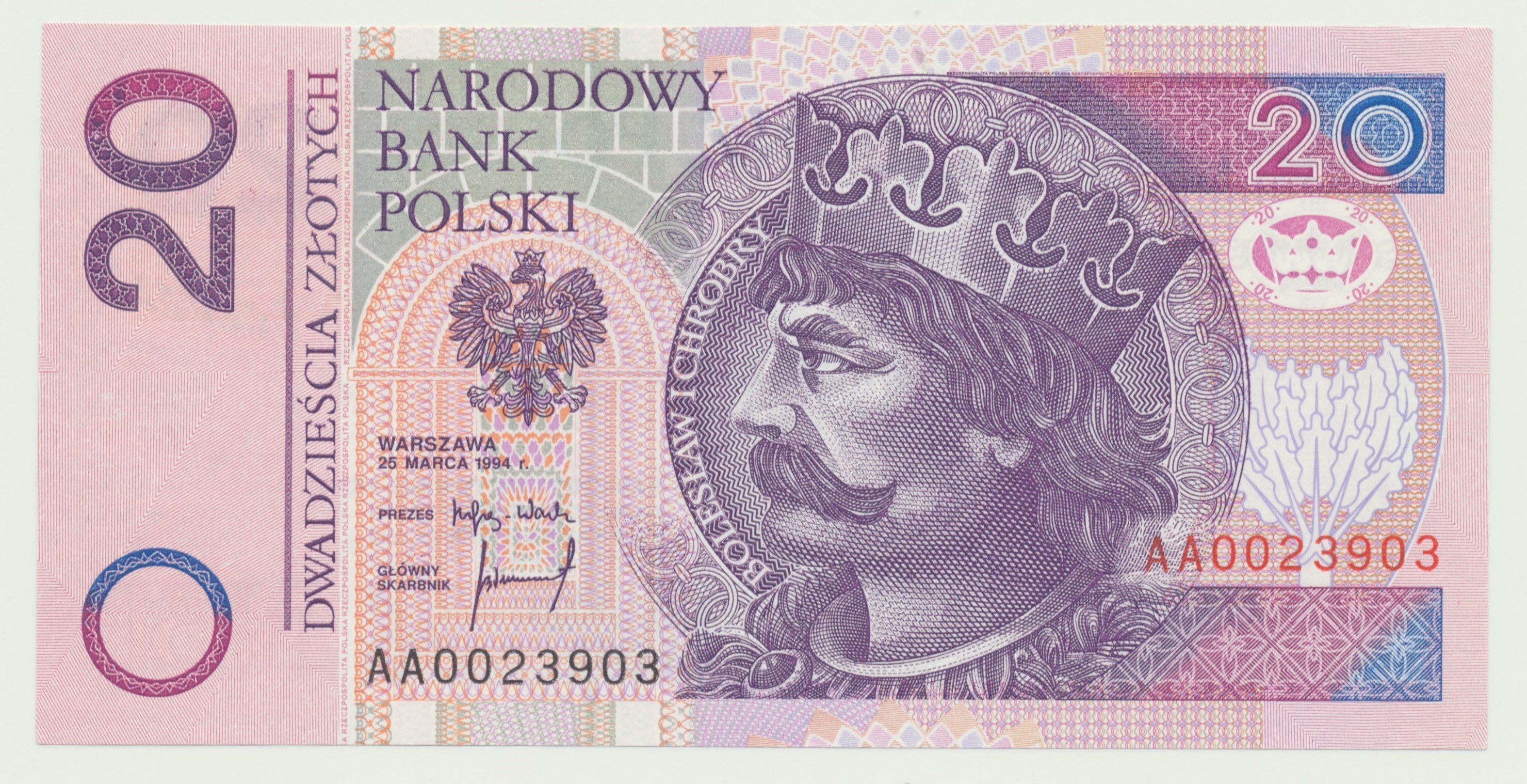 20 złotych 1994, druk TDLR Londyn, AA 0023903, dwa zera na początku