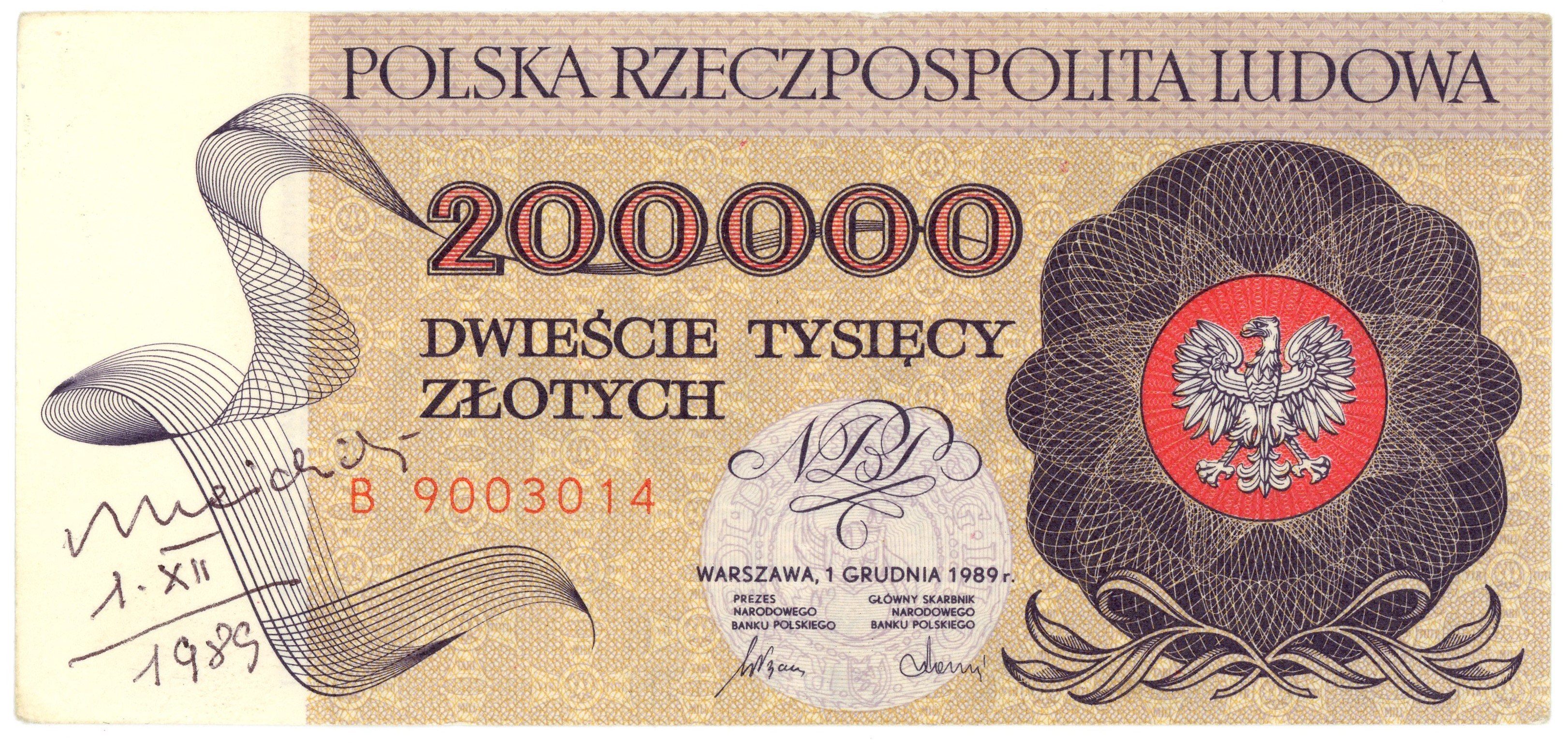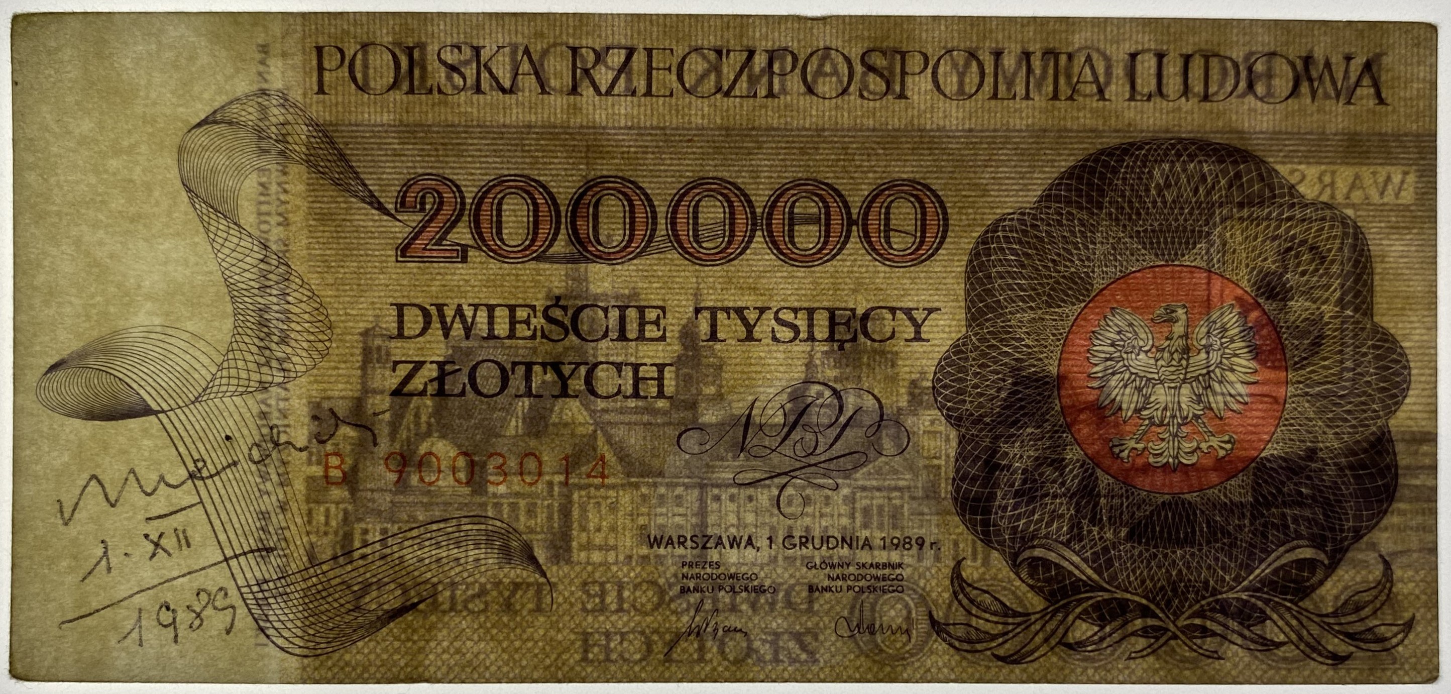 Banknot z autografem i datą projektanta Andrzeja Heidrich: Heidrich 1.XII.1989