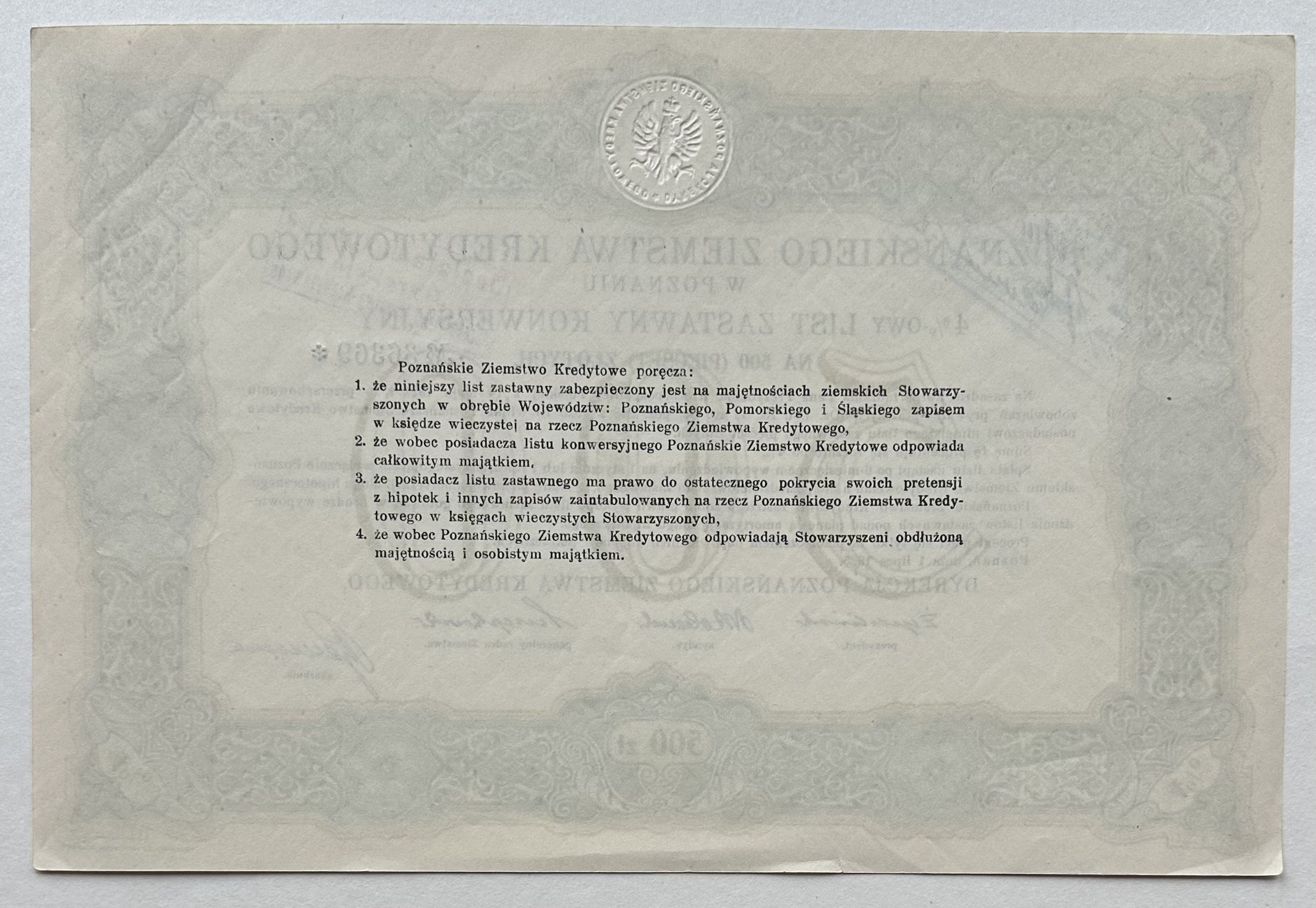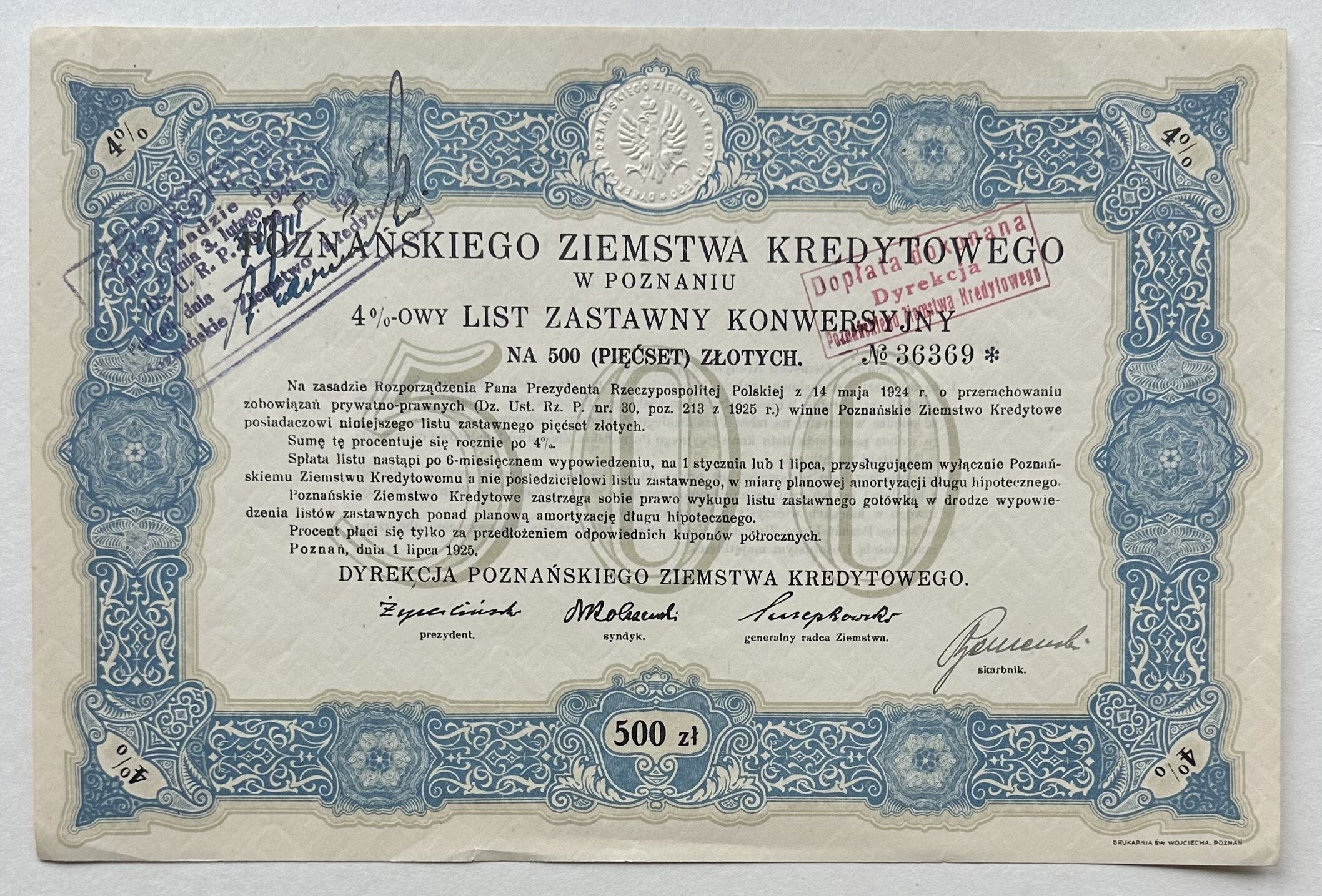 4% List zastawny Poznańskiego Ziemstwa Kredytowego konwersyjny, 500 złotych 01.07.1925
