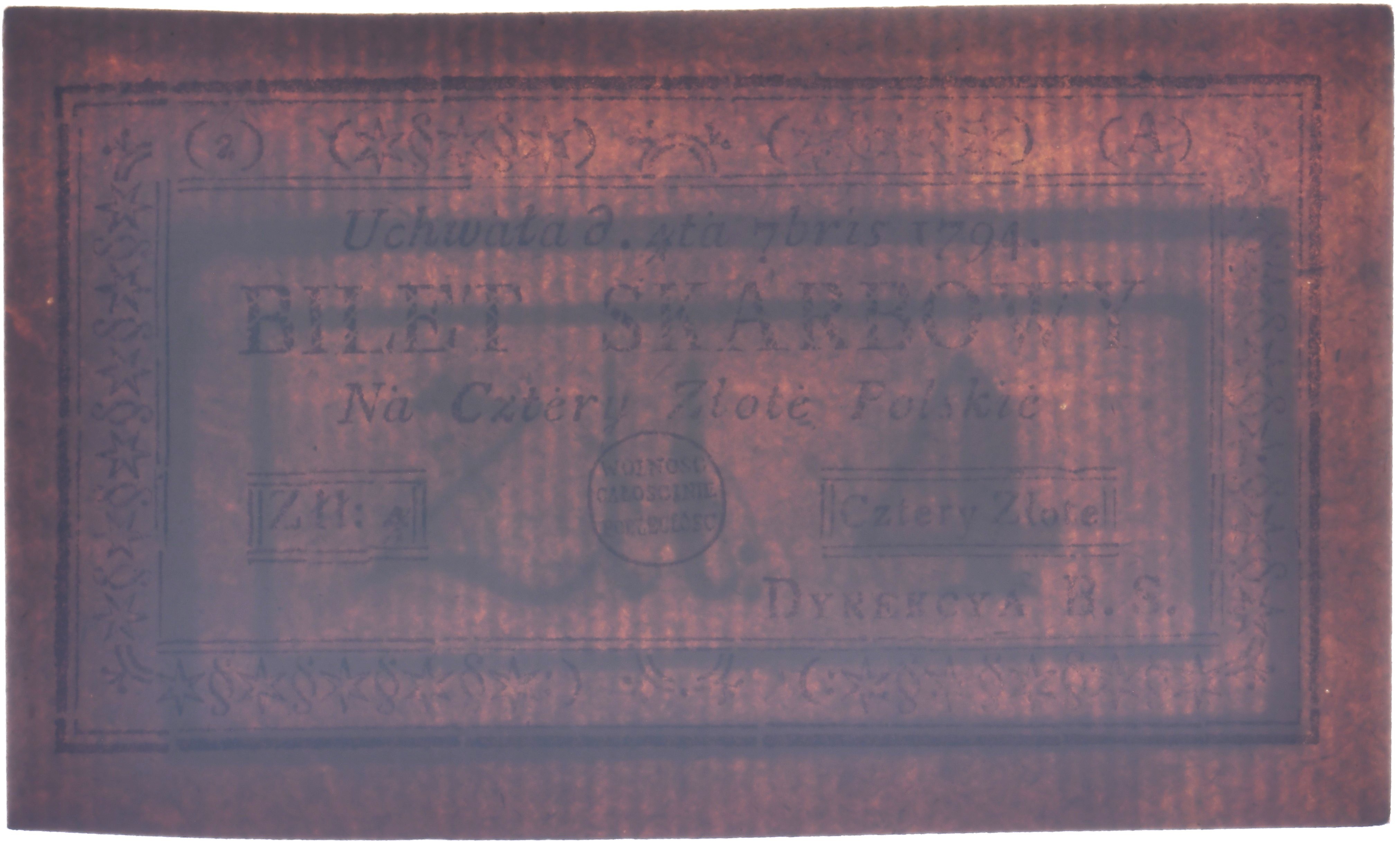 Banknot delikatnie ugięty przez pole zadrukowane, bez kreski pod światło