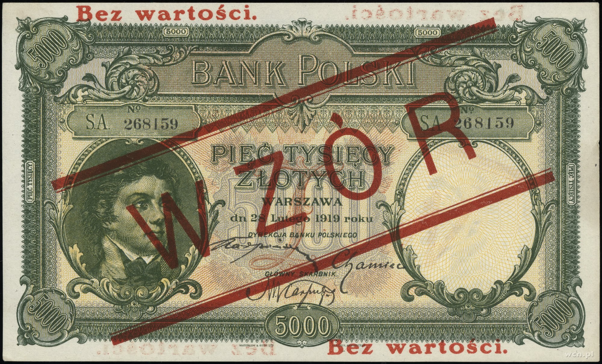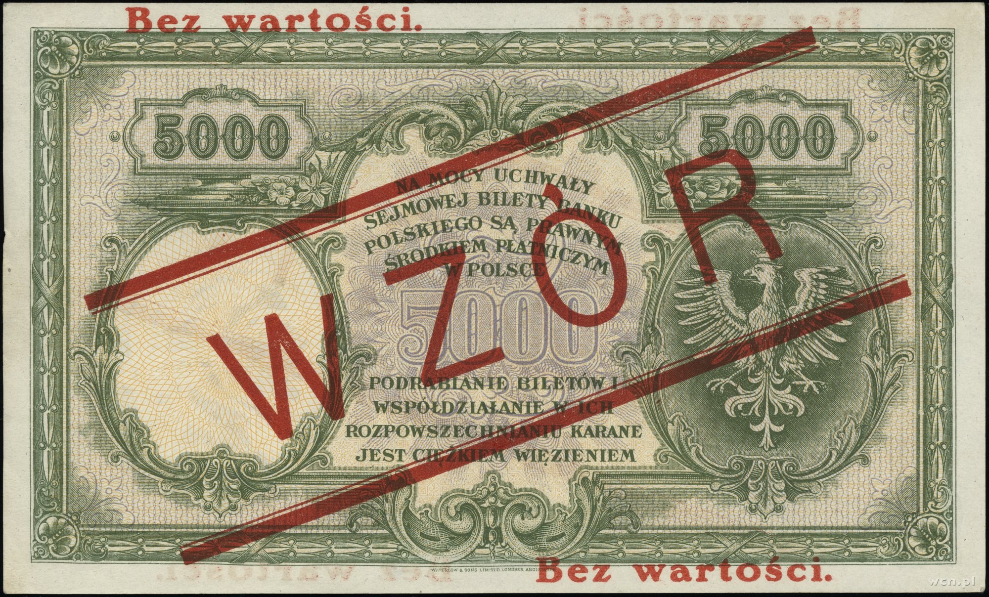 emisje po reformie Władysława Grabskiego, 5.000 złotych, 28.02.1919; seria A, numeracja 268159, czerwony nadruk WZÓR i dwukrotnie poziomo BEZ WARTOŚCI po obu stronach banknotu, bez perforacji; Lucow 601 (R5), Miłczak 56Wa; zaniedbywalne zagniecenia papieru na marginesach, nieświeże, ugięte rożki banknotu, ale pięknie zachowany egzemplarz.
