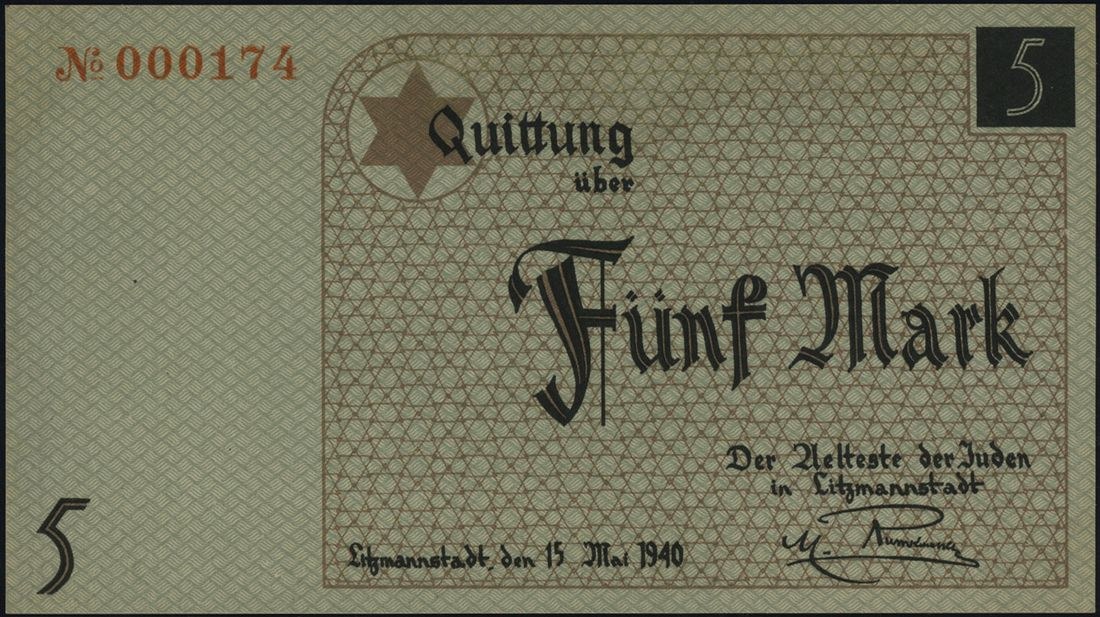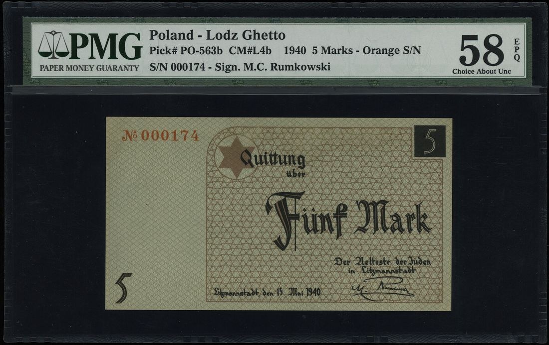 Getto Łódzkie 1940-1944, 5 marek 15.05.1940, papier kartonowy, na stronie odwrotnej stempel ENTWERTET, numeracja 000174, Lucow 859 (R3), Miłczak’05 Ł4c, Miłczak’12 L4b, Campbell 4204, w opakowaniu firmy PMG z oceną Choice About UNC 58, bardzo ładnie zachowane i bardzo rzadkie