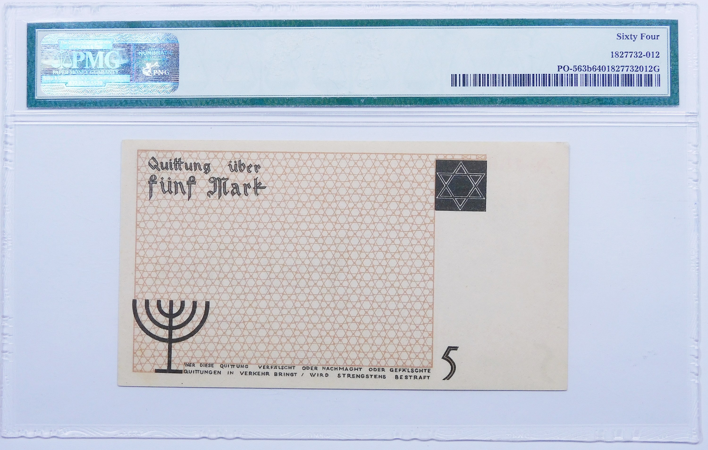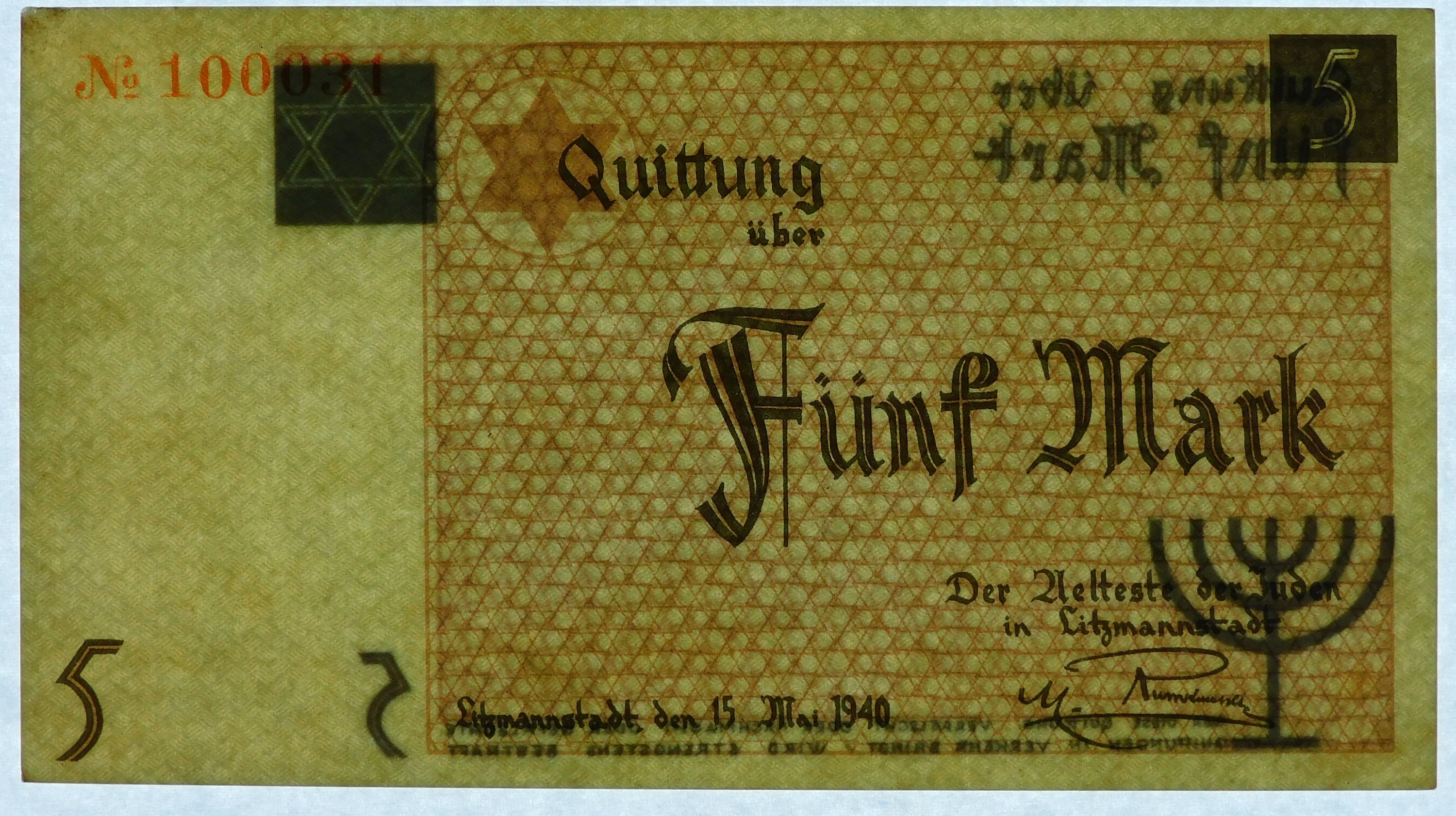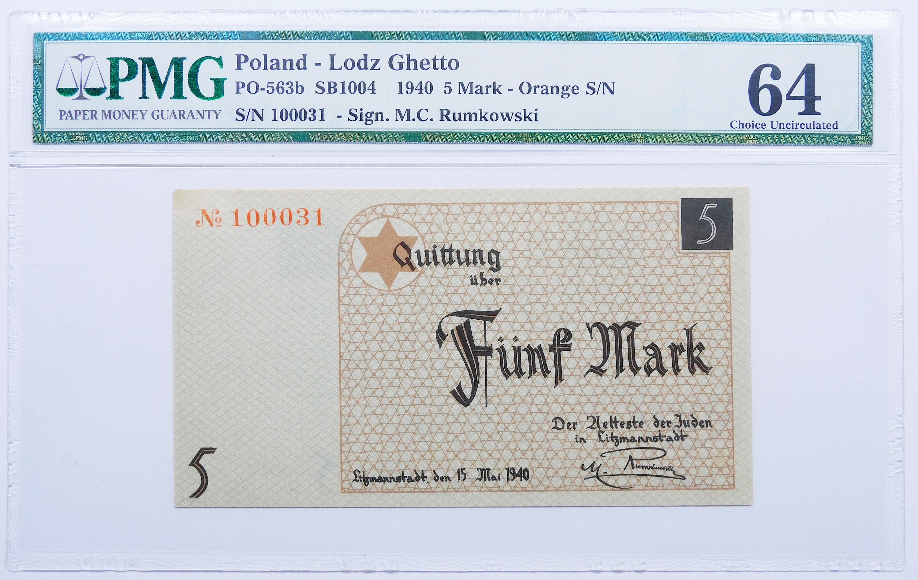 Banknot 5 marek 1940 Getta Łódzkiego, rzadkiej odmiany, druk na papierze kartonowym (grubym). Numeracja 100031, sam numerator - typu 1, z jedną kreseczką pod „o” w No i jak we wszystkich znanych egzemplarzach tej odmiany (papier kartonowy) mamy postać nadruku numeracji w kolorze pomarańczowym.