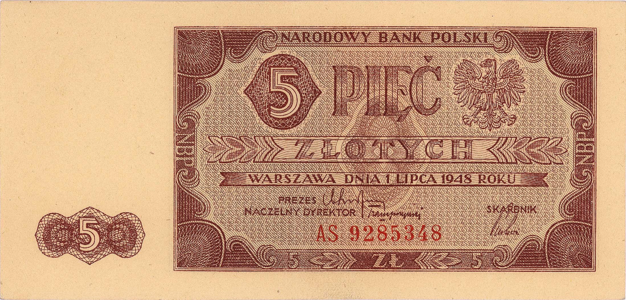 Banknoty powojenne 1944-1989, 5 złotych 1.07.1948, seria AS, Miłczak 135b