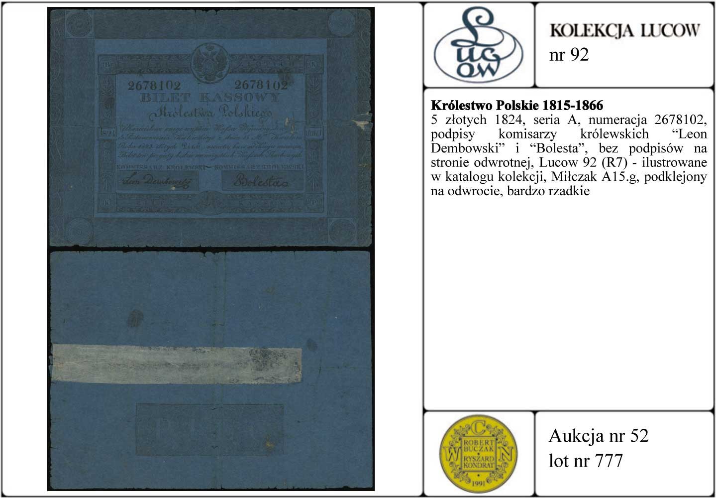 Królestwo Polskie 1815-1866, 5 złotych 1824, seria A, numeracja 2678102, podpisy komisarzy królewskich \Leon Dembowski\" i \"Bolesta, bez podpisów na stronie odwrotnej