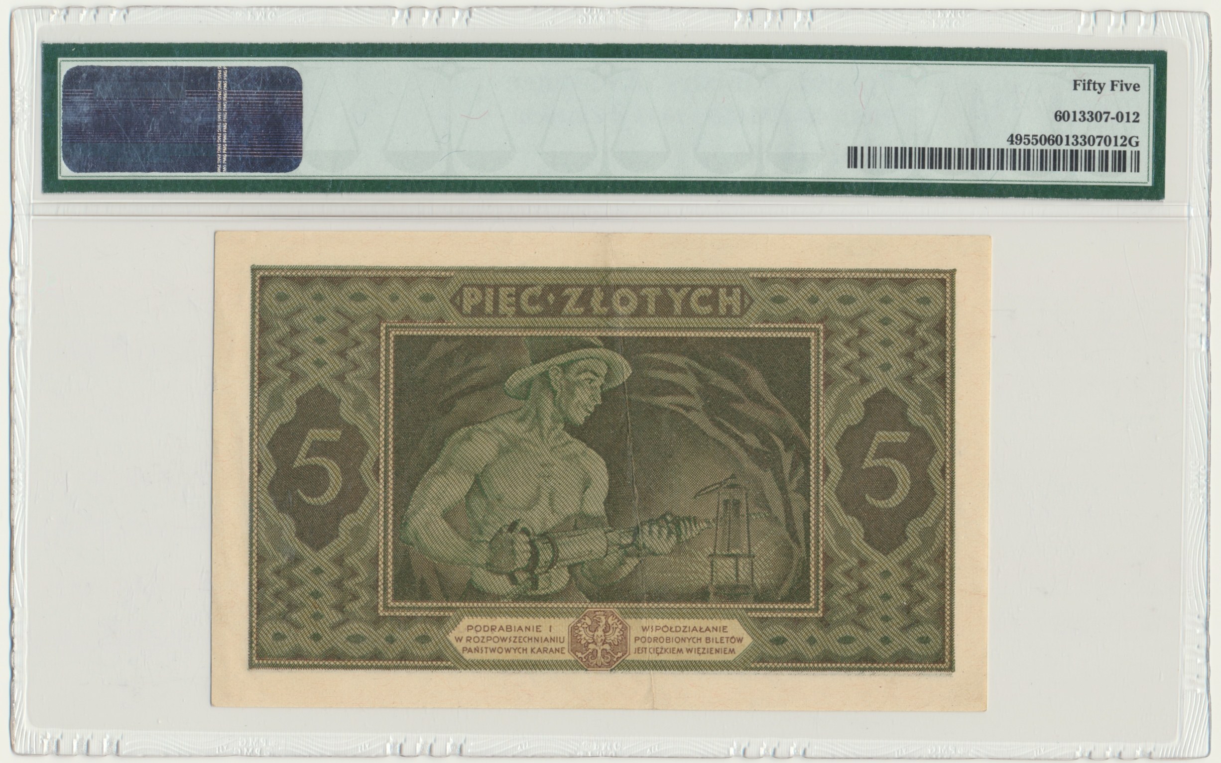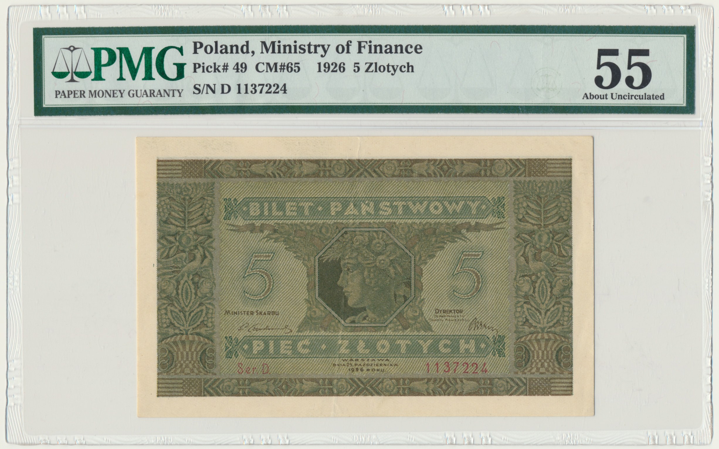 Banknot opatrzony certyfikatem PMG z oceną PMG 55.