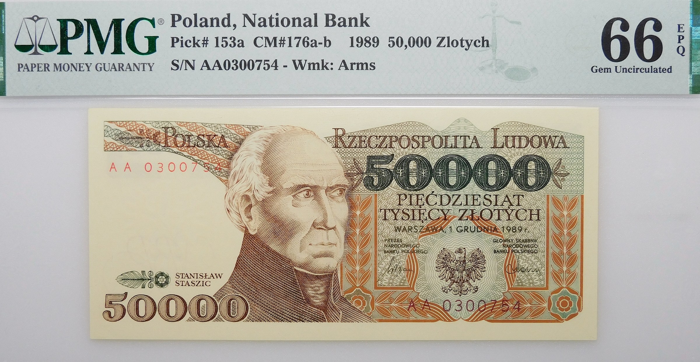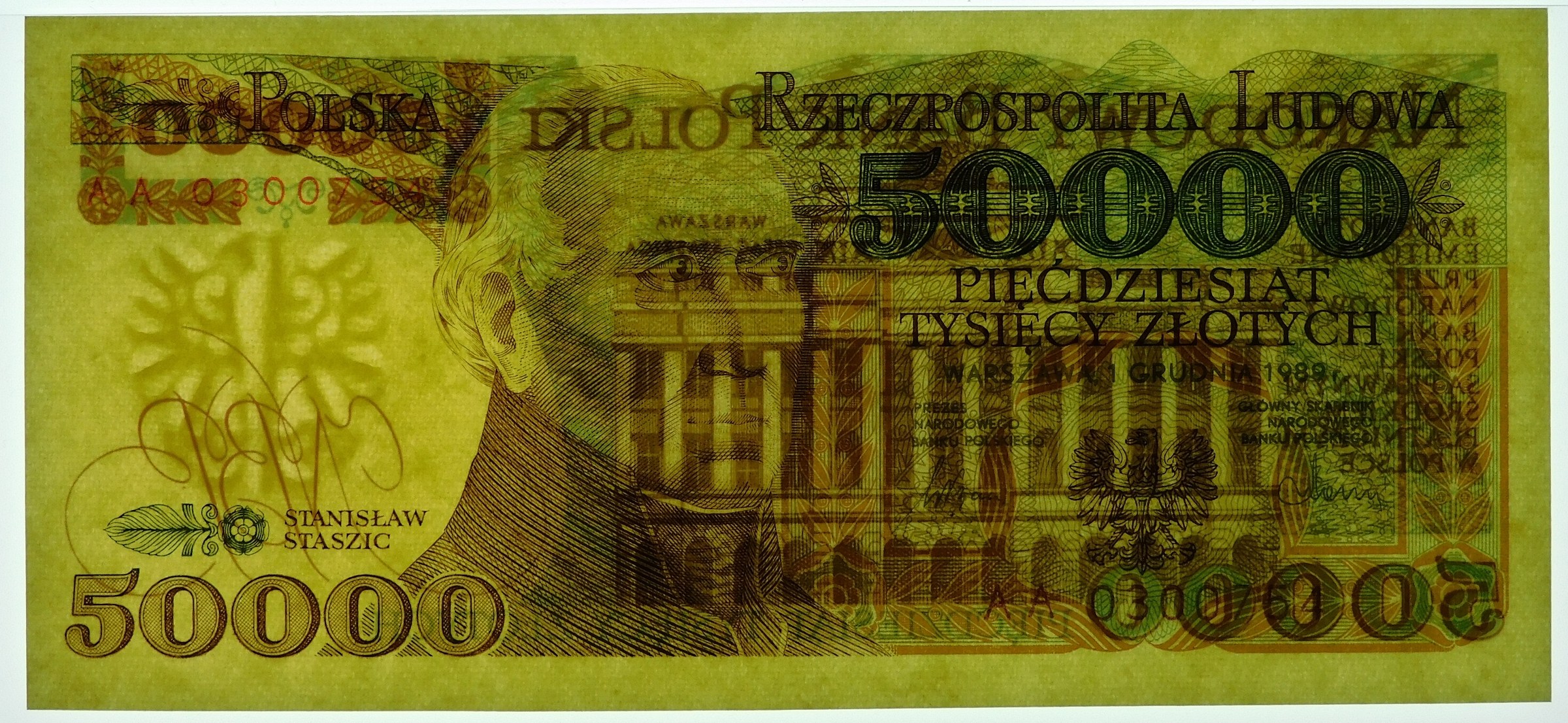 Banknot 50.000 złotych 1989, ser. AA - poszukiwana pierwsza dwuliterowa seria tego nominału/rocznika.