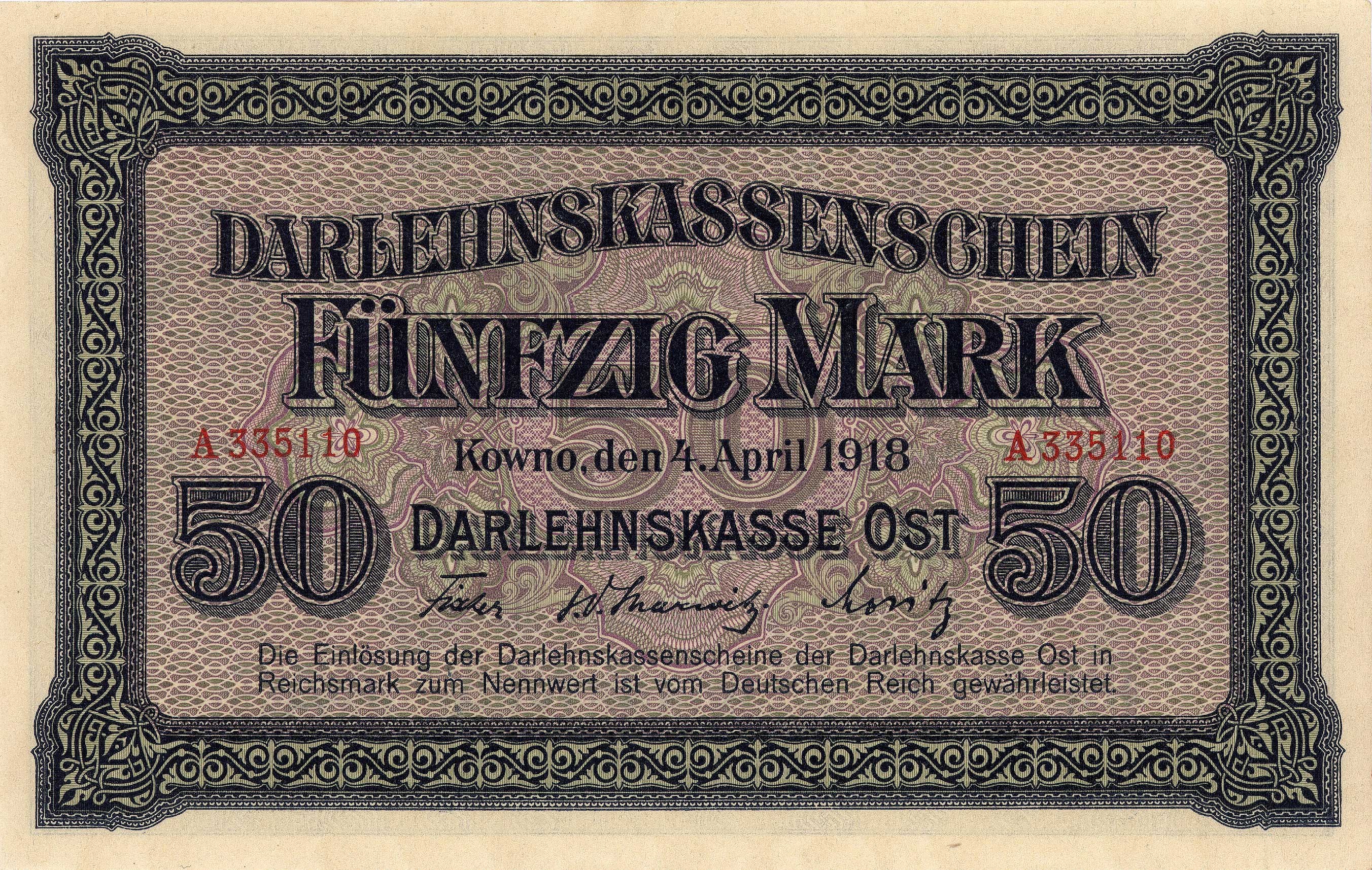Banknoty niemieckich władz okupacyjnych dla terenów wschodnich 1916-1918, 50 marek 4.04.1918, Kowno, Miłczak K6
