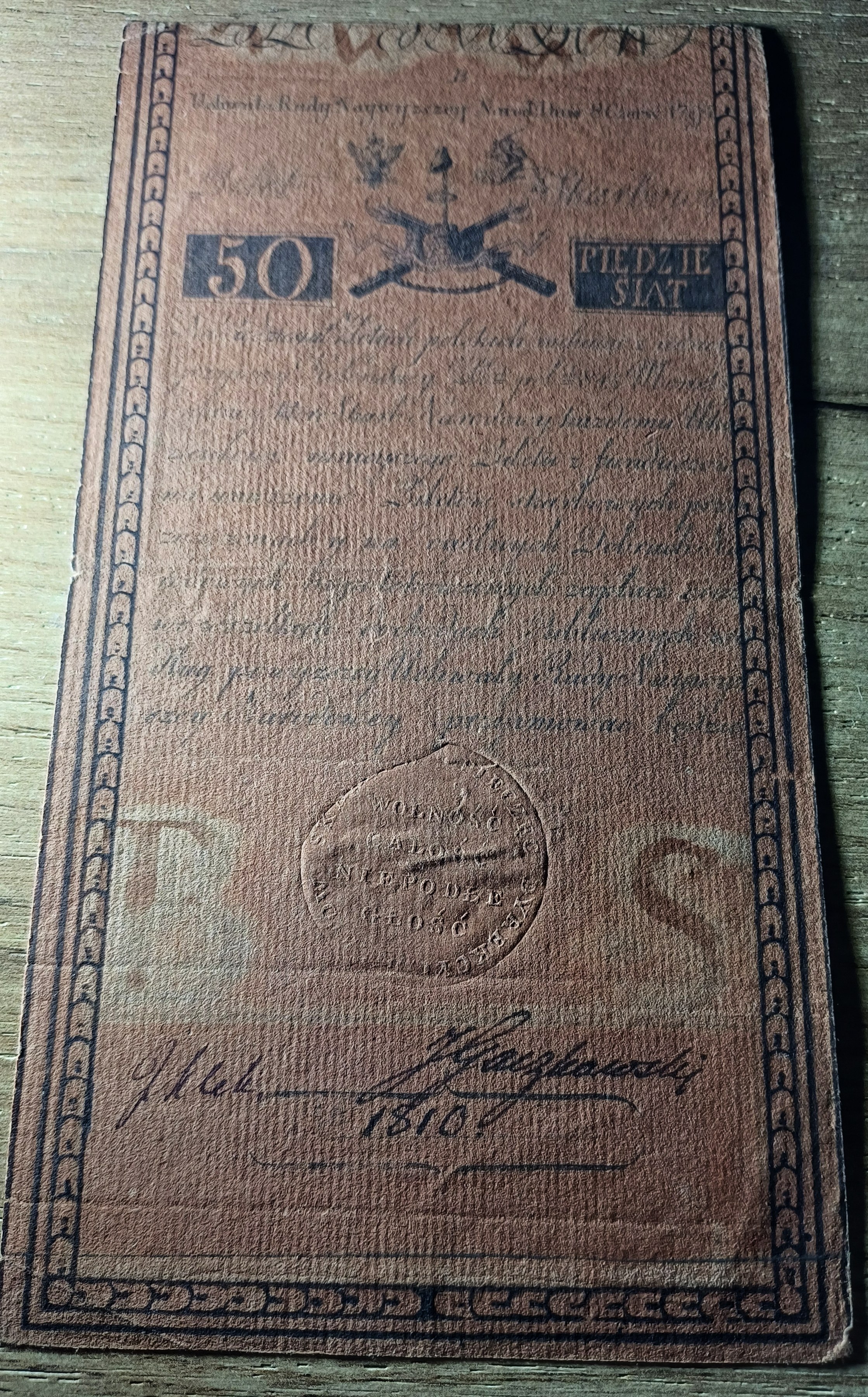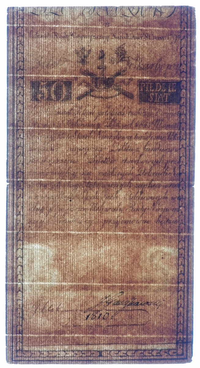 Bilet skarbowy Insurekcji Kościuszkowskiej 50 złotych 1794, serii A i numeracji 4-cyfrowej: 1810 (zdecydowanie rzadziej spotykaną od 5-cyfrowej).
