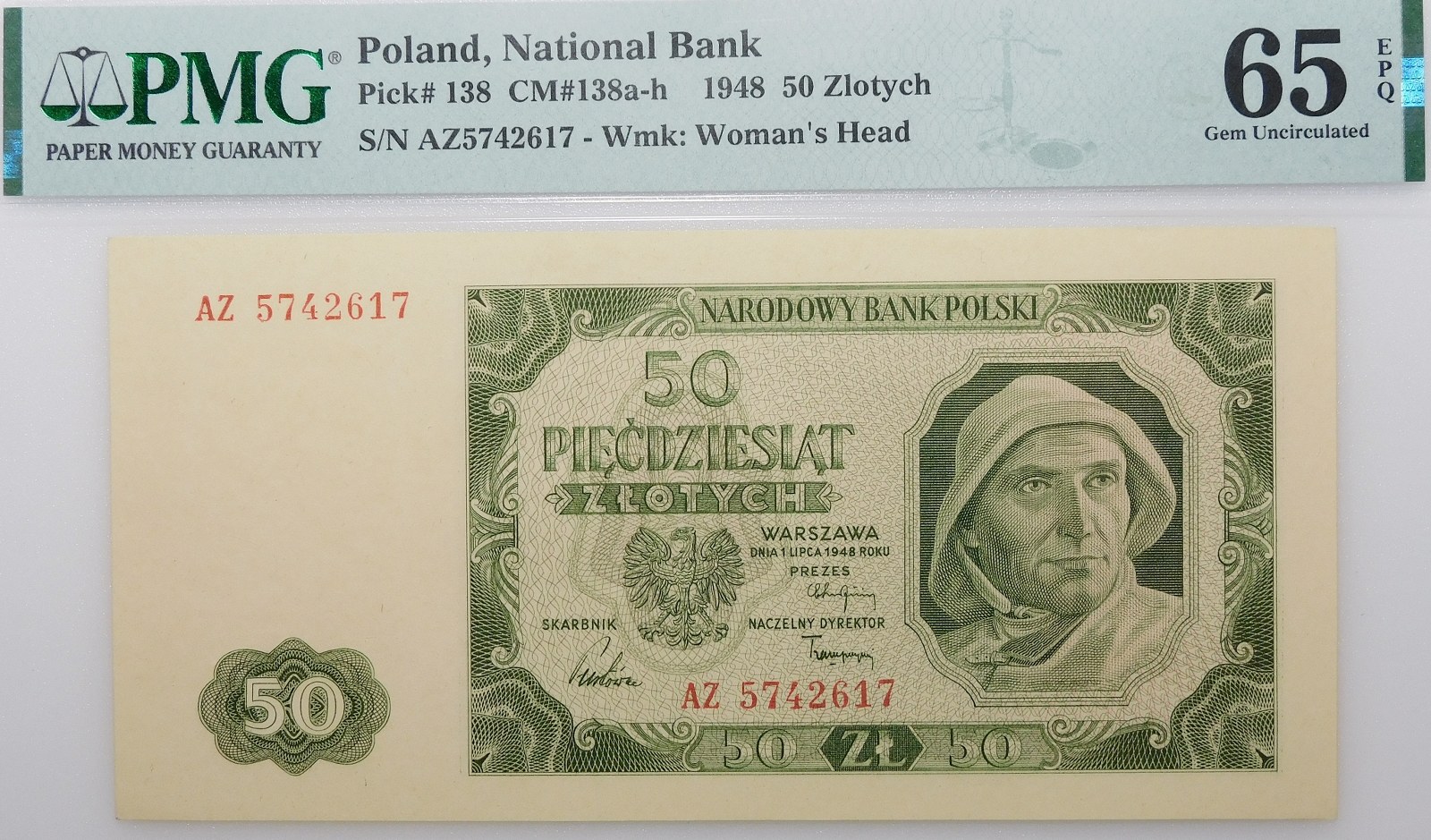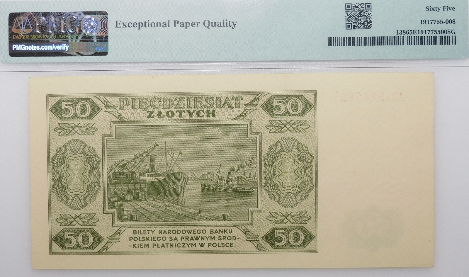 Atrakcyjny egzemplarz rzadszej odmiany tego nominału, potwierdzony wysoką notą gradingową PMG, z adnotacją EPQ świadczącą o wyjątkowej jakości papieru.