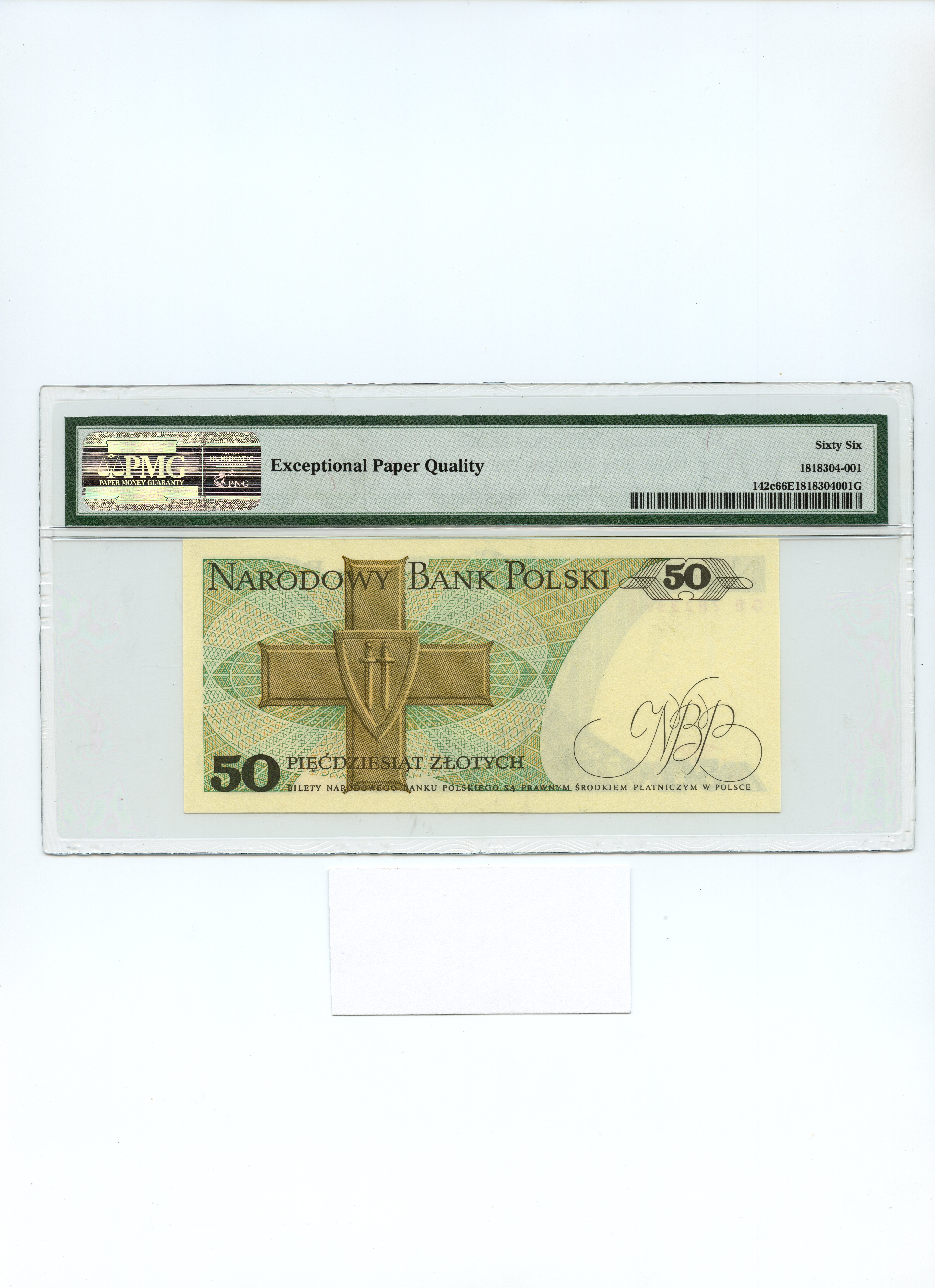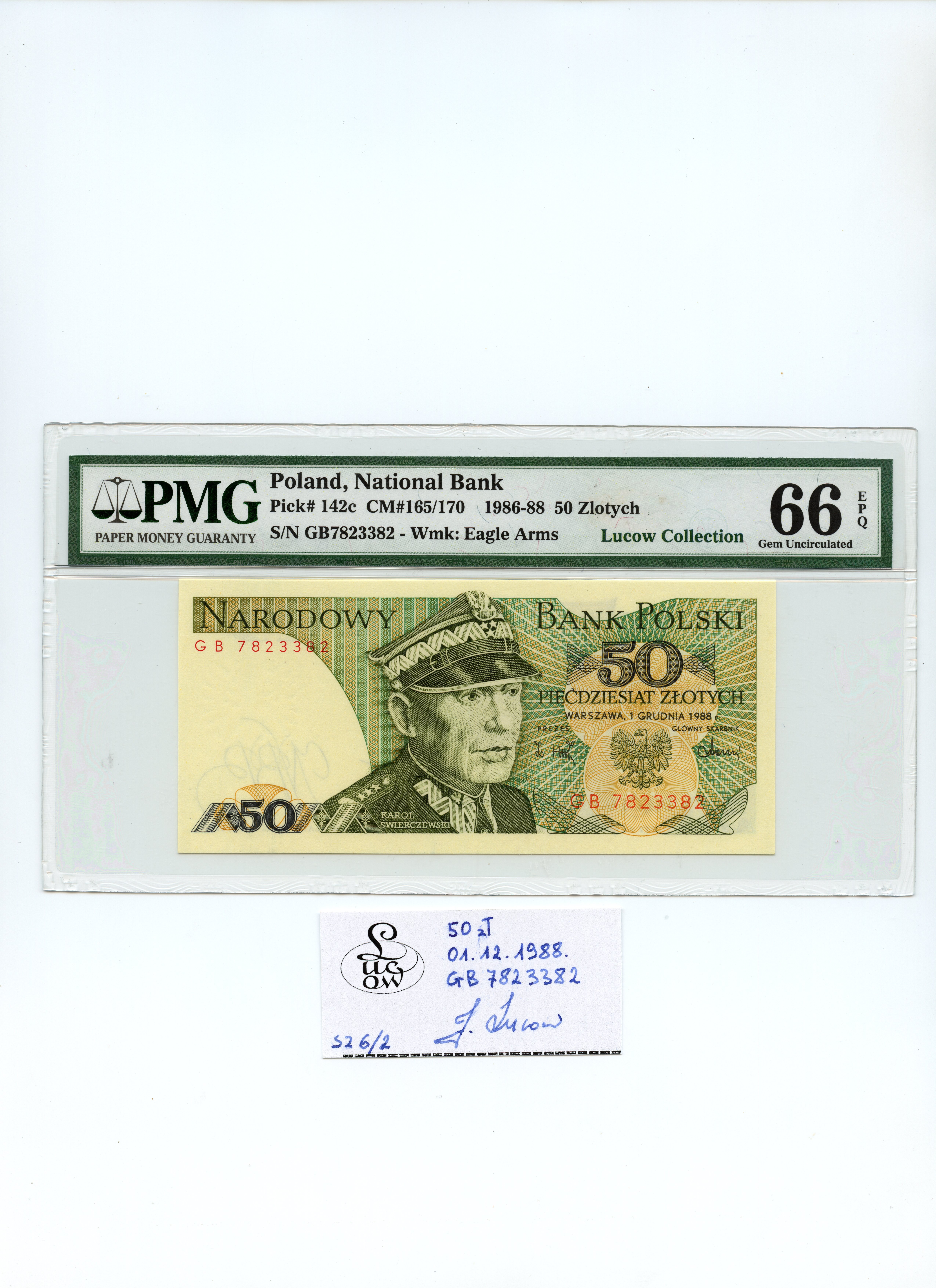 50 złotych 1988 seria GB, PMG 66 EPQ, banknot z kolekcji LUCOW wraz z odręcznie wyposaną karteczką