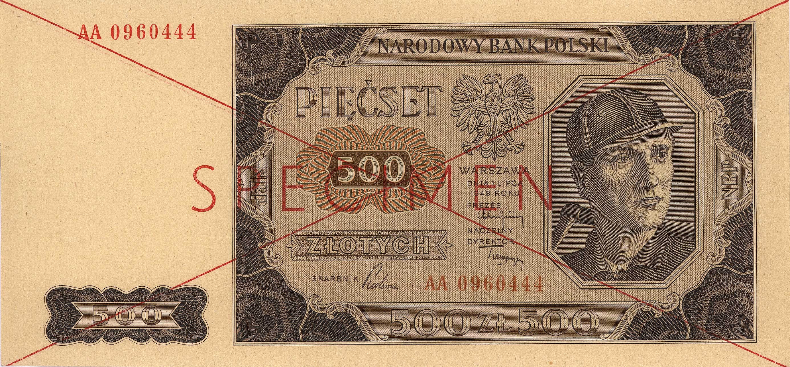 500 złotych 1.07.1948, seria AA 0960444, SPECIMEN, Miłc...