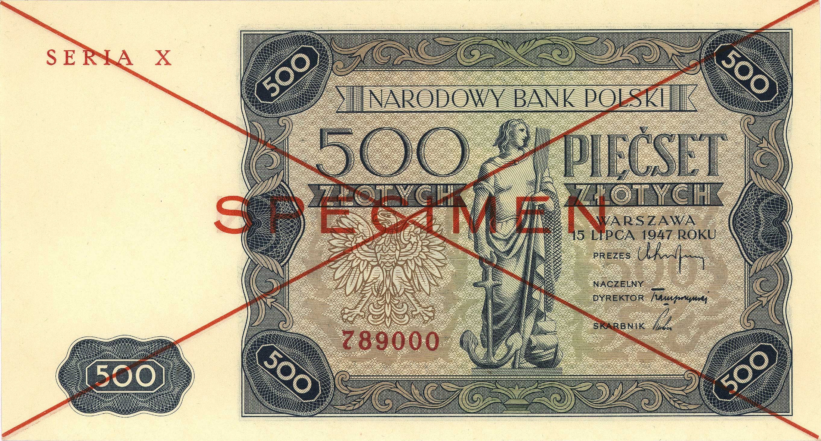 500 złotych 15.07.1947, seria X 789000, SPECIMEN, Miłcz...