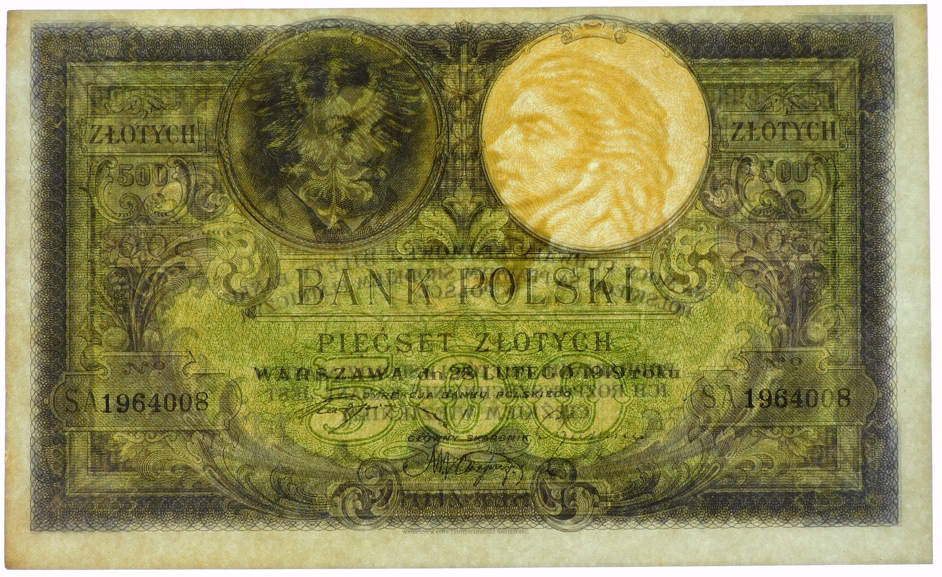 Banknot 500 złotych 28.02.1919 - odmiana z numeratorem wysokim = 3,75mm , dłuższym = 21mm