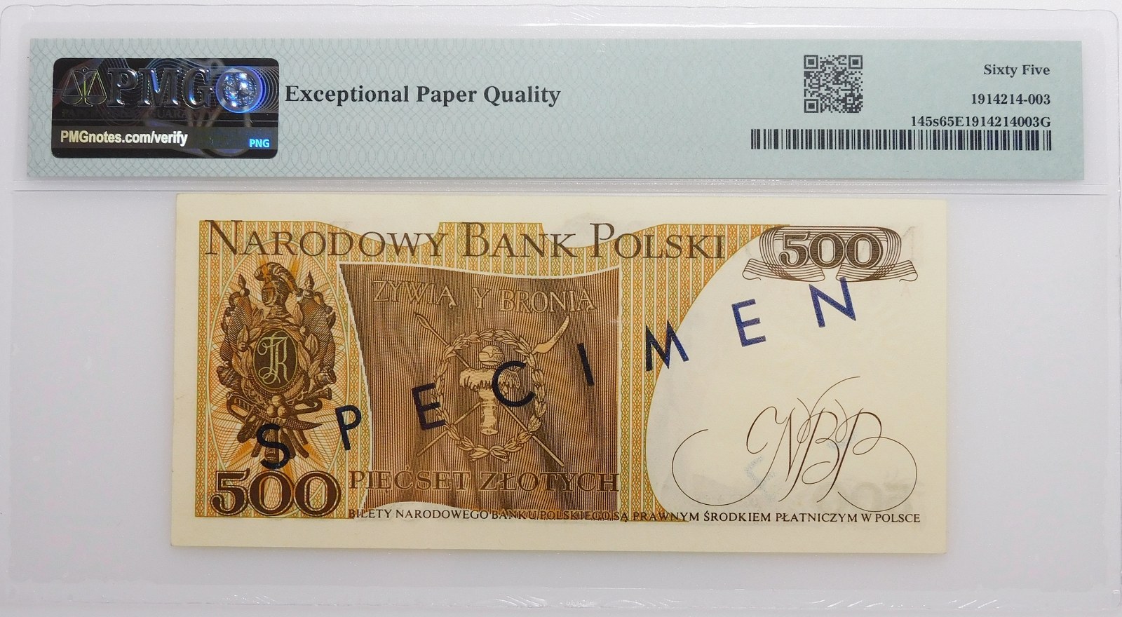 Banknot 500 złotych 1974, ser. A - numeracja bieżąca - nadruk SPECIMEN tylko na rewersie