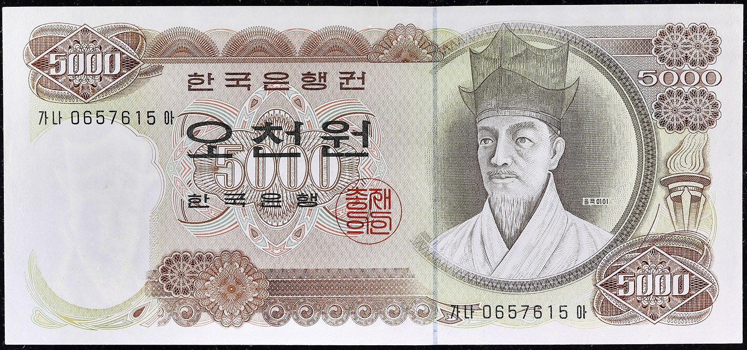 Alphabet AB - numéro 0657615H, avec le portrait confucéen de Yulgok Yi I (1536-1584) au recto sur le côté droit du billet de banque. Au verso, on retrouve une vue de la banque de Corée au centre.