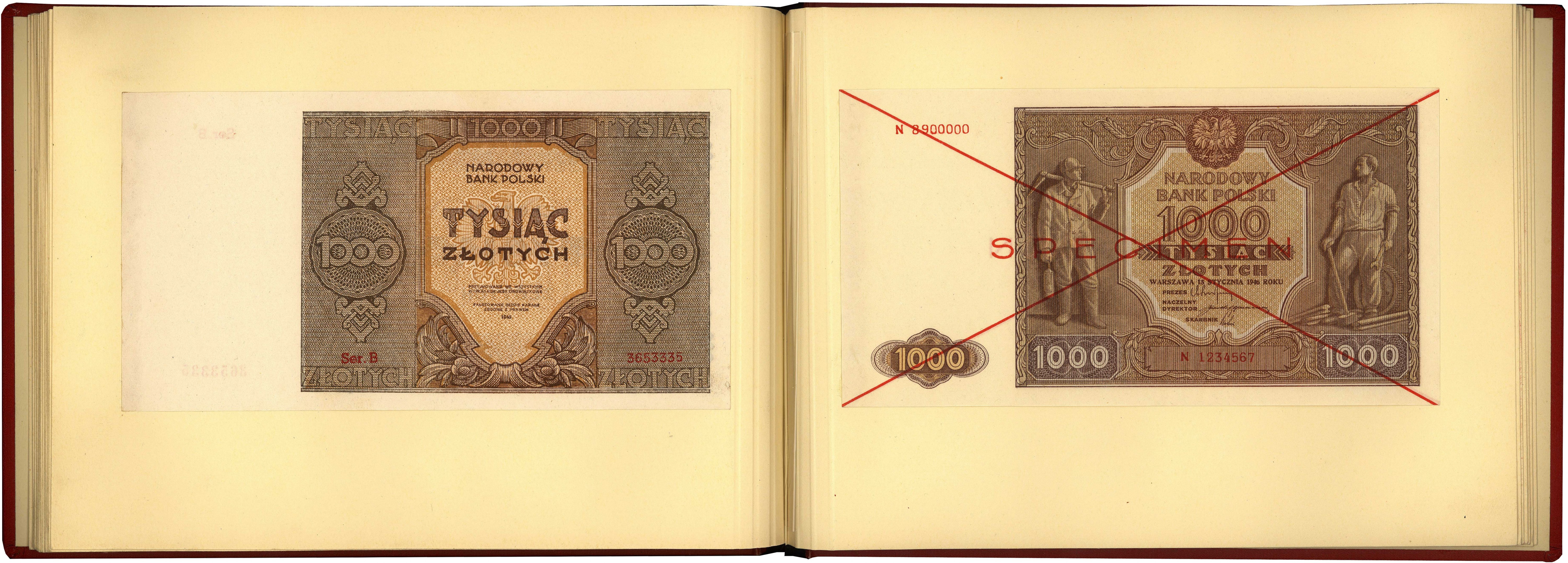 Banknoty powojenne 1944-1989, album NBP z 31 banknotami od 1944 do 1965 roku, przyklejone marginesy banknotu, 28 wzorów i 3 banknoty obiegowe, między innymi 1.000 złotych 1945 r.