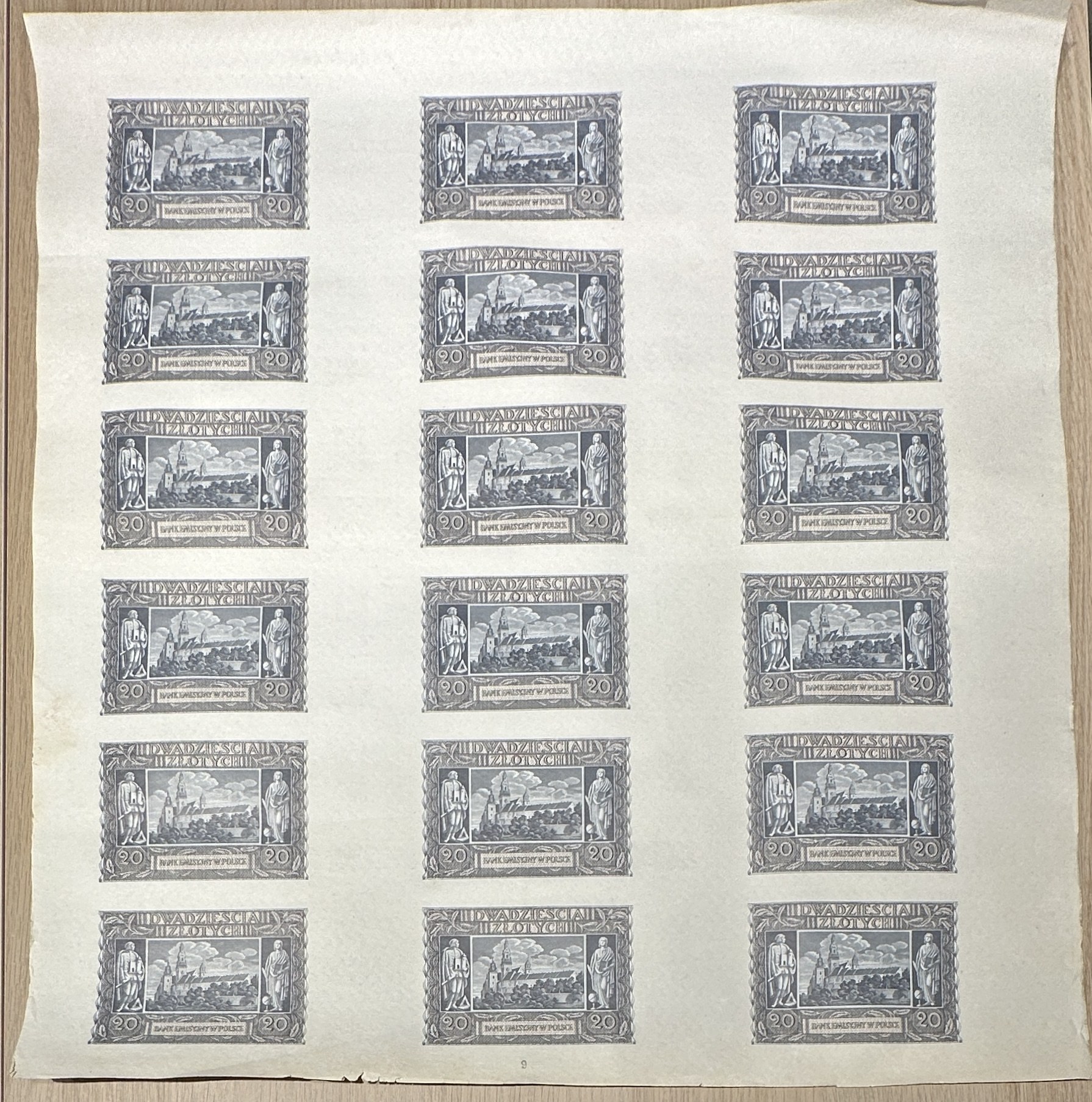 Papier z prawidłowym znakiem wodnym, bez oznaczenia serii oraz numeracji, na dolnym marginesie cyfra 9