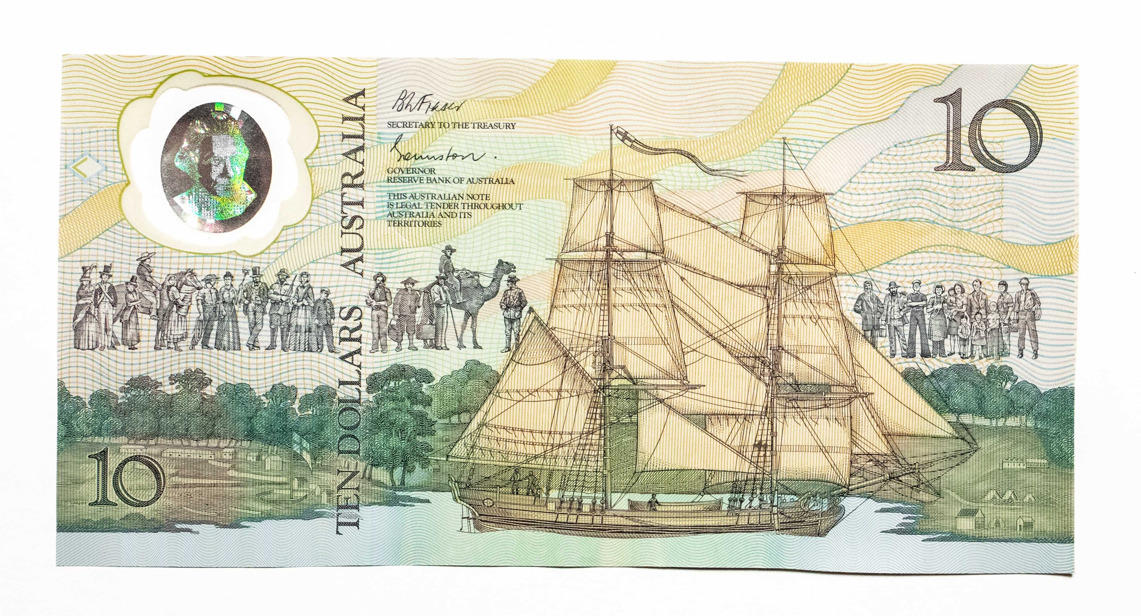 Banknot 10 dolarów z poprzedniej serii banknotów Australii. Bez daty, około 1988 rok. Seria AB 13507304. Banknot polimerowy.