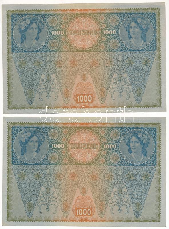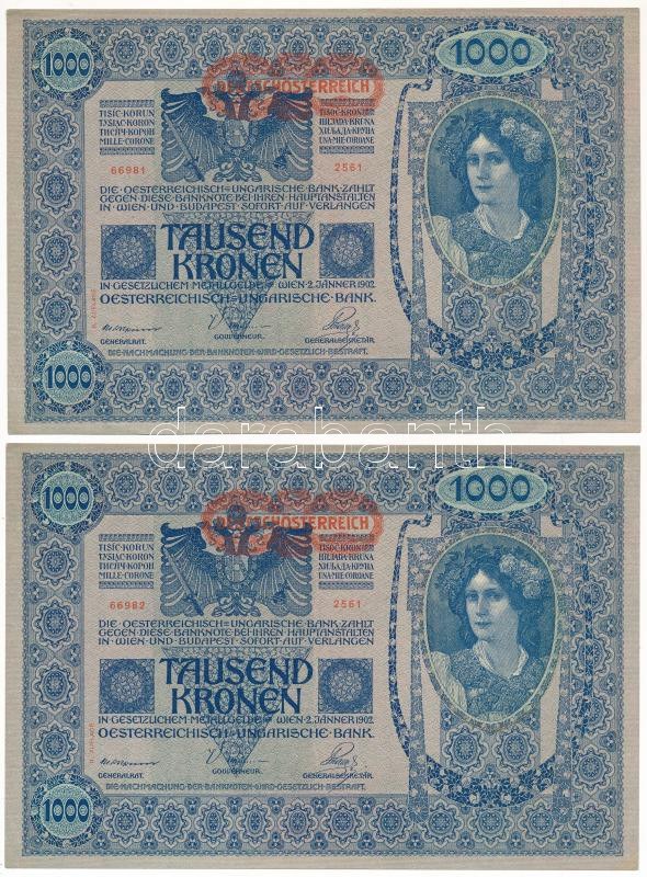 Ausztria 1919. (1902) 1000K (2x) 2. kiadás, sorszámkövetők "2561 66981 - 2561 66982" vízszintes "DEUTSCHÖSTERREICH" felülbélyegzéssel, hátlap rajzos T:UNC,AU / Austria 1919. (1902) 1000 Kronen (2x) 2nd issue, consecutive serials "2561 66981 - 2561 66982" with horizontal "DEUTSCHÖSTERREICH" overprint, with illustrated backside C:UNC,AU Krause P#61