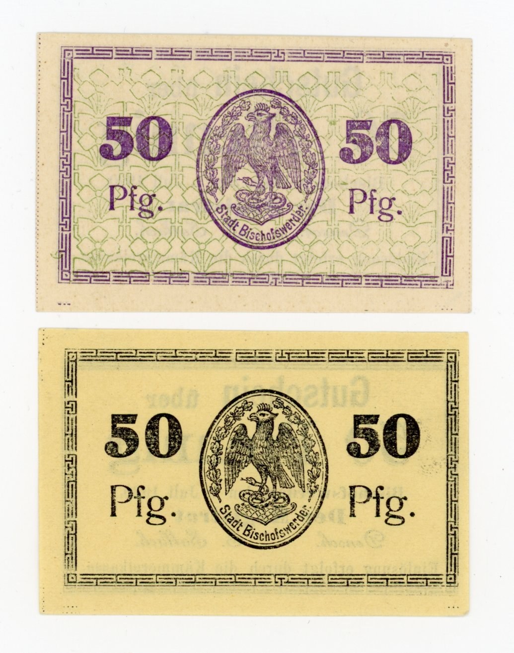 Biskupiec/Bischowswerder, 50 fenigów 1920. Dwie odmiany. Razem 2 szt. Stany zachowania 1. Literatura: Podczaski WS-200/E1/3b oraz WS-200/E2/3c