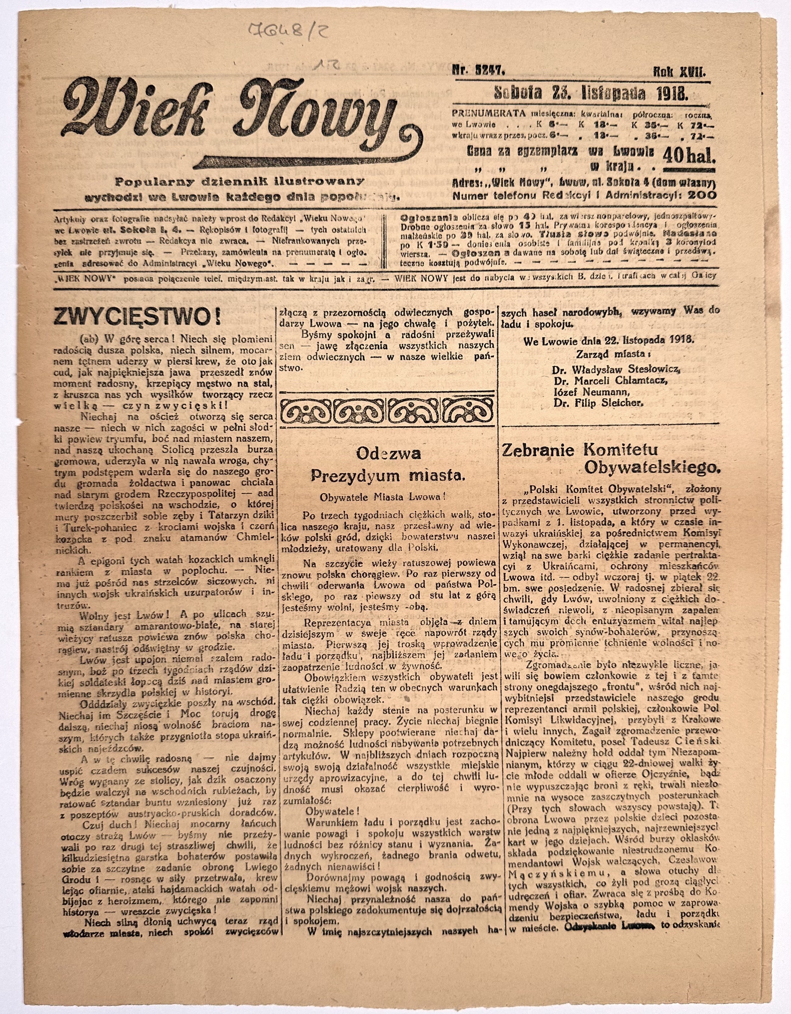 Numer "Wieku Nowego" z dn. 23 XI 1918 r., a więc dzień po przejęciu kontroli nad miastem przez Wojsko Polskie.