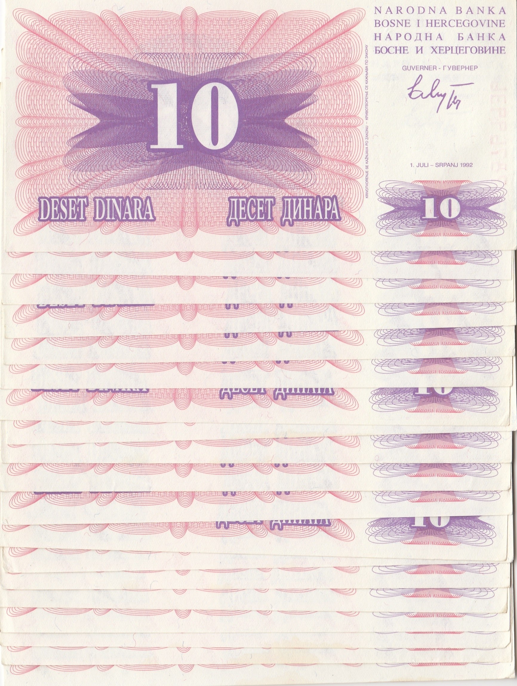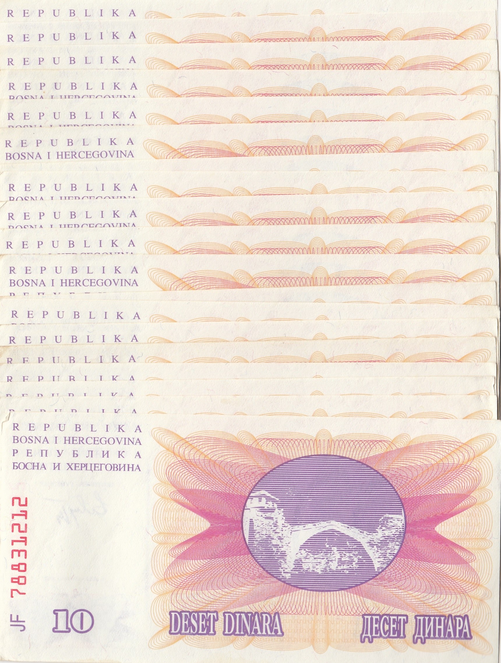 Bosnai Herzegovina, 10 Dinara, 1992, UNC, p10, (Total 21 banknotes)