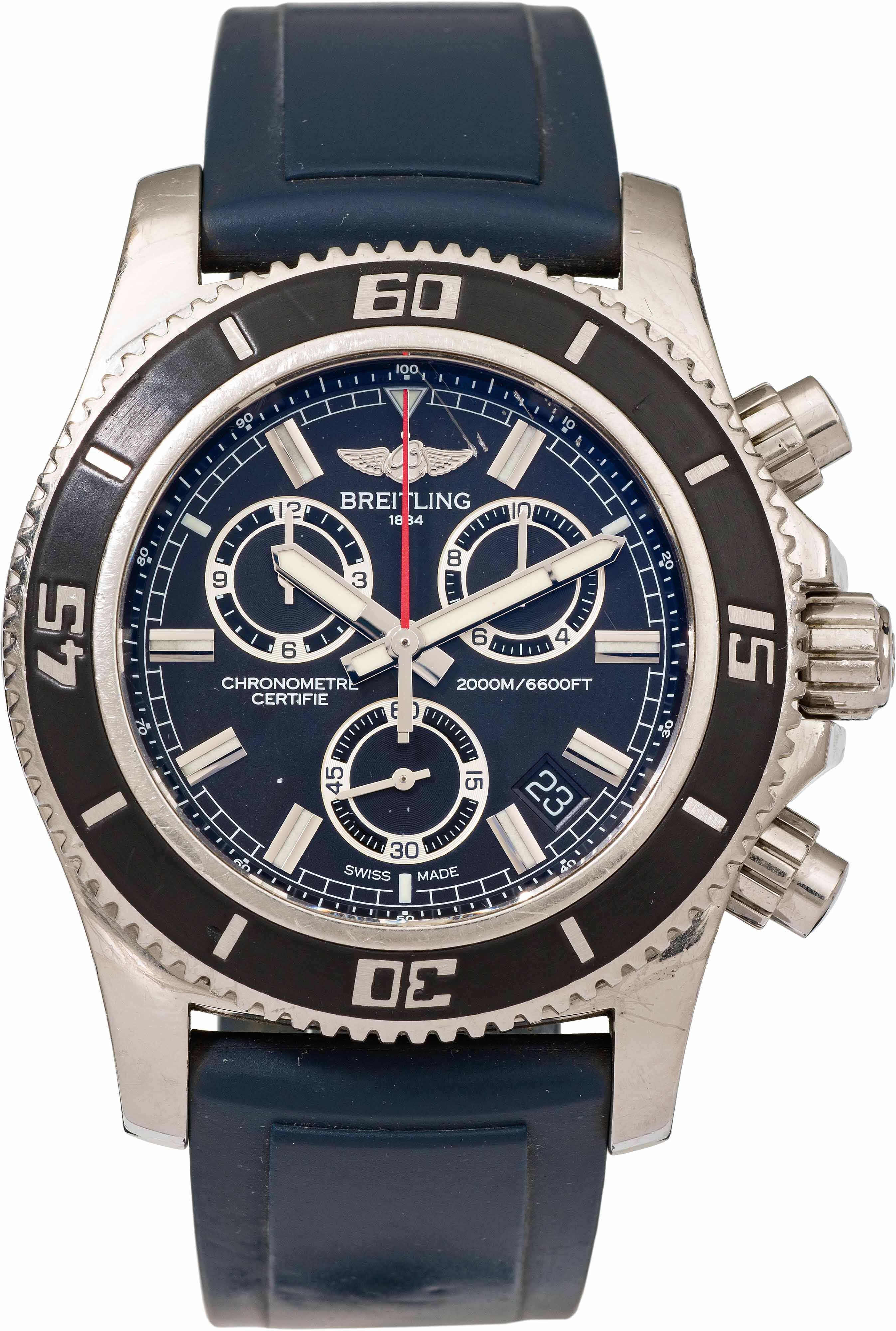 stainless steel, rubber; sapphire glass, darkblue dial with date, chronograph and small second; stainless steel case with turnable bezel, pusher, screwed crown and bottom; quartz movement; original blue rubber watchband and steel folding clasp