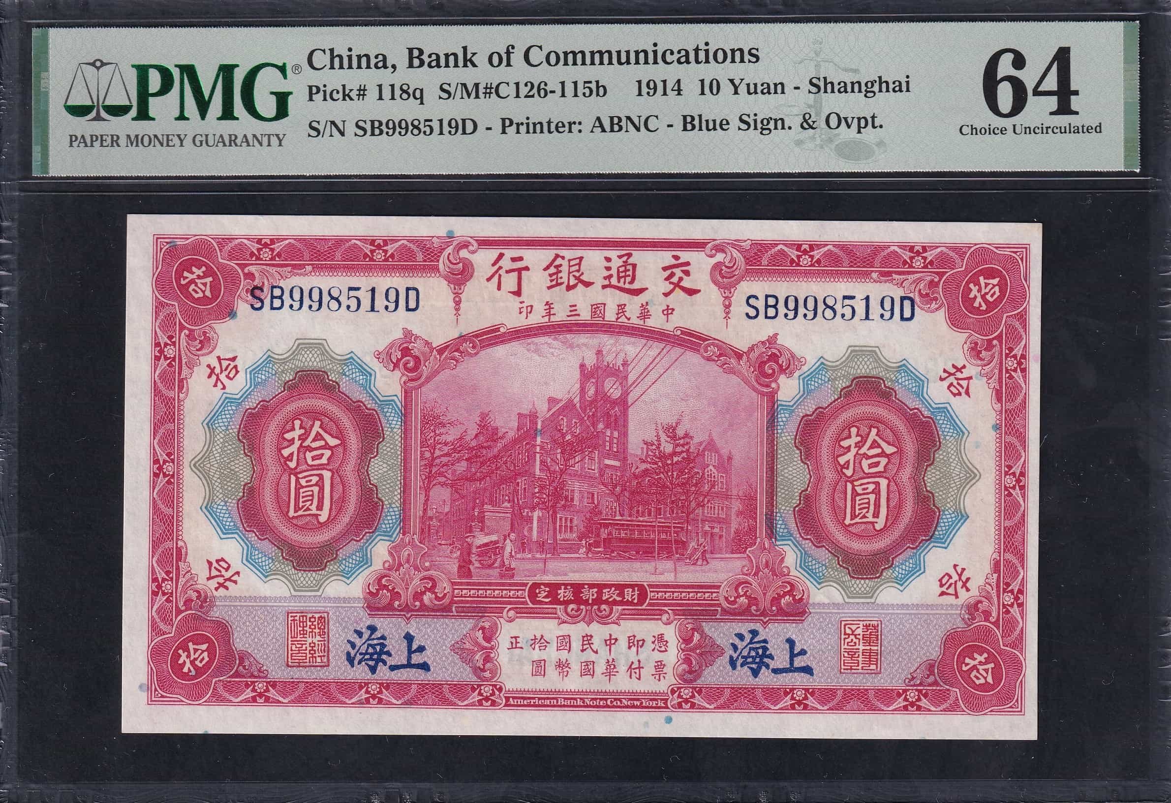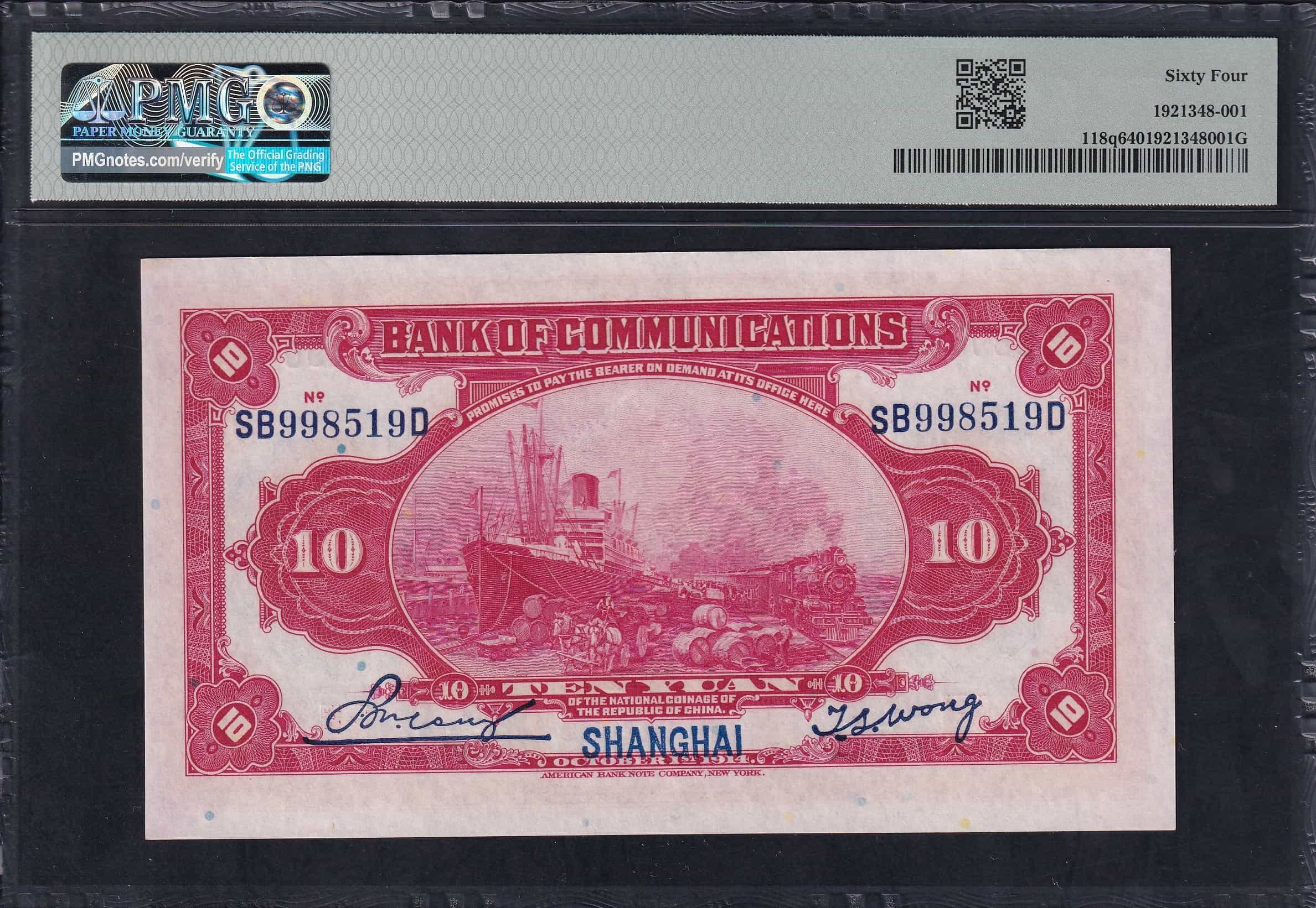 China, Bank of Communications, 10 Yuan - Shanghai, 1914, Choice UNC 64, Pick: 118q