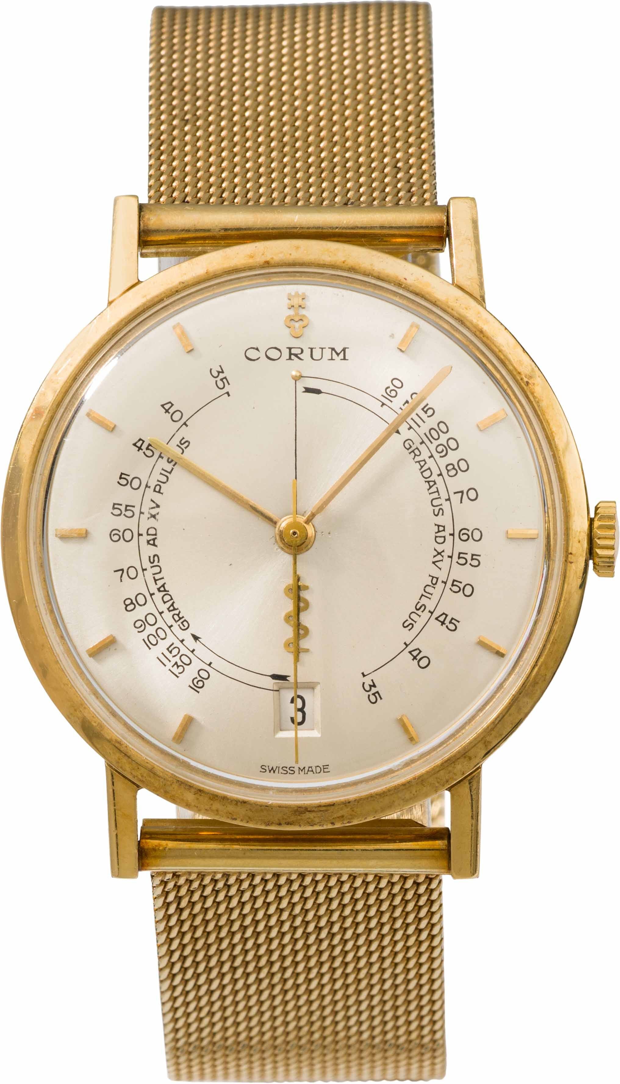 18k gold; acrylic glass, champagne-coloured dial with date and pulsometer scale; automatic, calibre "2452"; gold case, original gold watchband and clasp; Corum-etui