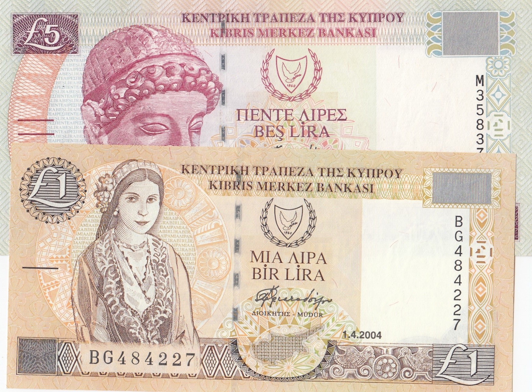 Cyprus, 1 Pound and 5 Pounds, 2003/2004, UNC, p60d, p61b, (Total 2 banknotes)