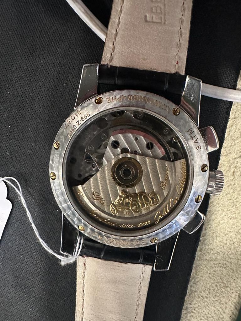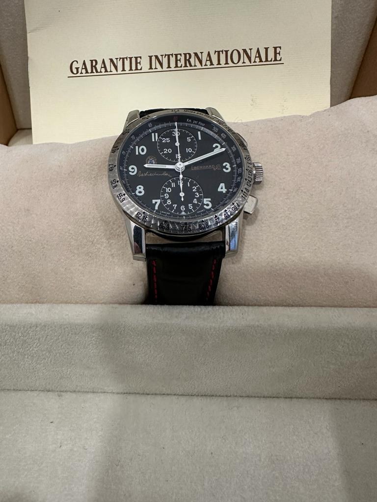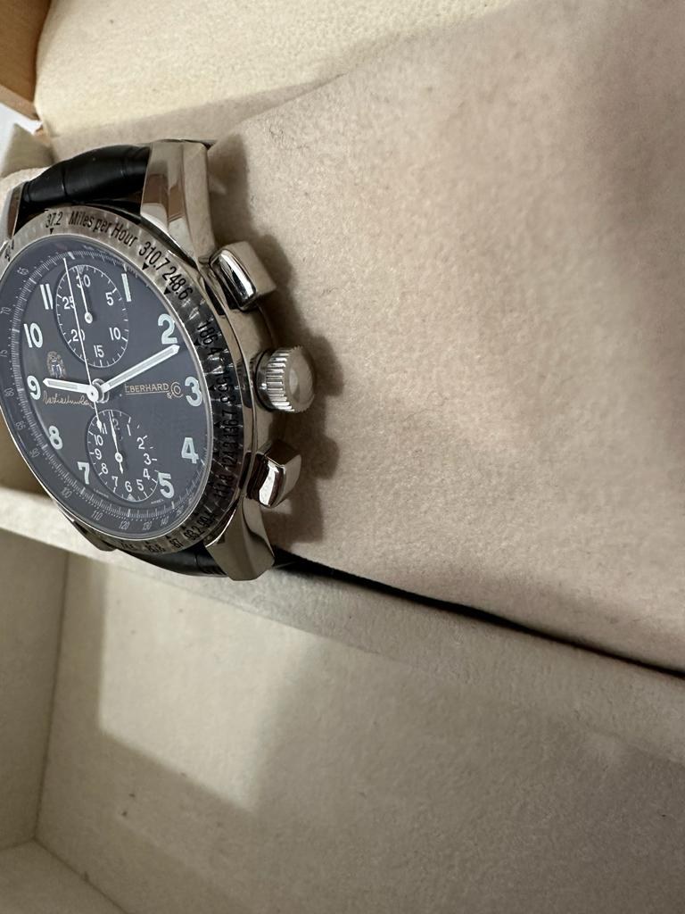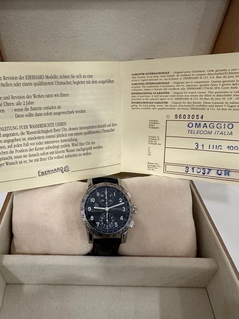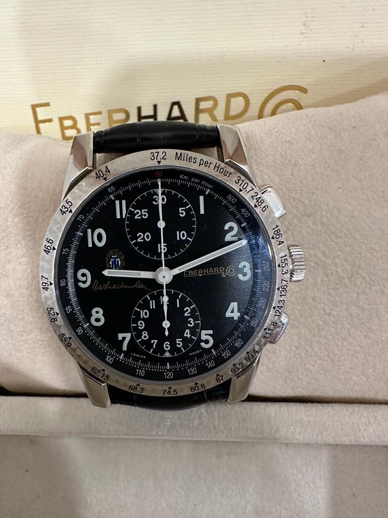 Brand Eberhard & Co. Model (Watch) Tazio Nuvolari Reference number 31037 Case material Steel Strap material Leather Year of production 1996 (Approximate year) Kit With original box and original documents Winding Automatic Case material Steel Diameter 39.5 mm Bezel material Steel Sapphire glass Strap material Leather Pin clasp Clasp material Steel Functions Chronograph Other Transparent caseback, Luminescent numerals, Luminescent hands |