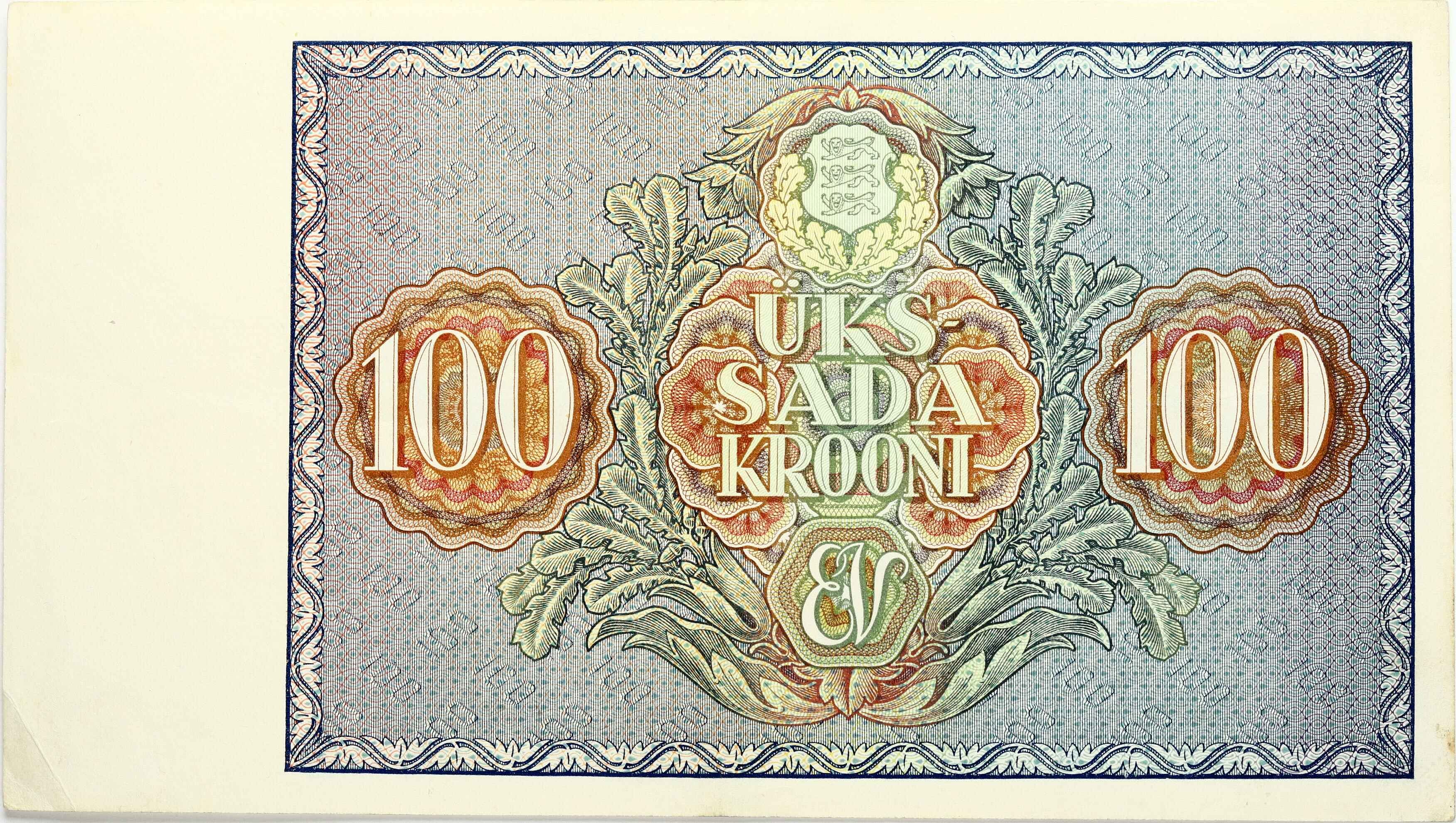 Estonia 100 Krooni 1935 Banknote. Obverse: Blue and black print. Blacksmith working at an anvil. Value in cartouche on right. Lettering: EESTI PANK 100 ÜKSSADA KROONI 1935. Reverse: Red and green print; blue background. Central floral design with on top coat of arms; on left and right center value in cartouches. Lettering: 100 ÜKS SADA KROONI EV. S/N 0151724. P# 66.