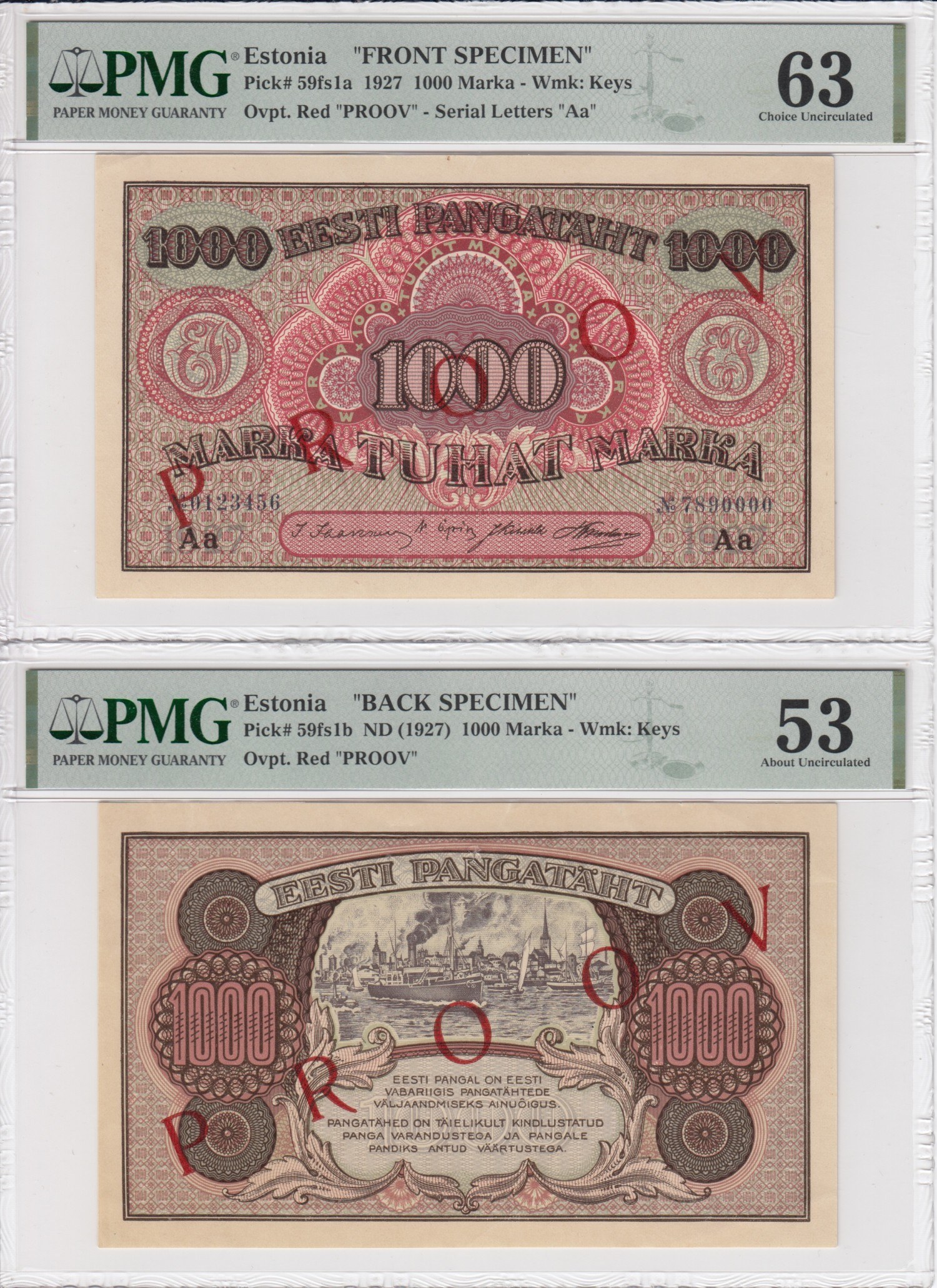 Estonia 1000 Marka 1927 - BACK & FRONT SPECIMEN - PMG 53 About Uncirculated & 63 Choice Uncirculated (2)