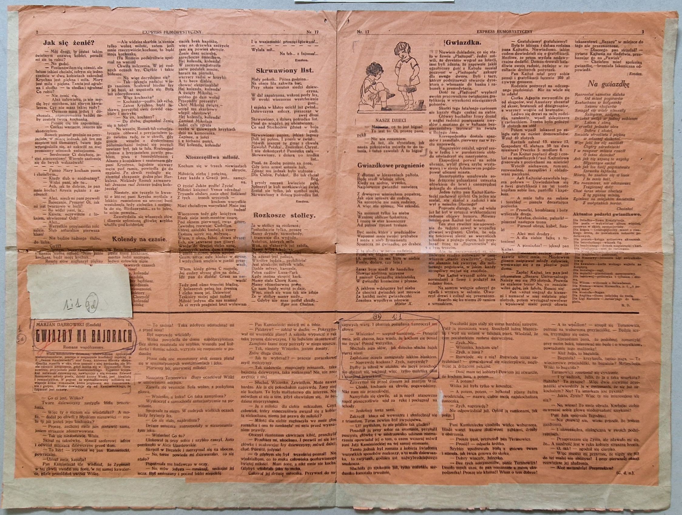 Stan: egzemplarz podniszczony, zagniecenia, pęknięcia na marginesach i w okolicy złożeń, ślady składania w pionie i poziomie, s.2-3 podklejone na brzegach białym papierem, dodatkowo podklejenia taśmą konserwatorską naddarć pośrodku, w miejscu składania, zakreślenia ołówkiem i czerwoną kredką, na s.2 przyklejony pasek papieru z opisem (do reprodukcji tytułu powieści w odcinkach): „1:1”. Na s.1 pod winietą pieczęć: Redakcja Tygodnika satyr.-humor. w Warszawie.