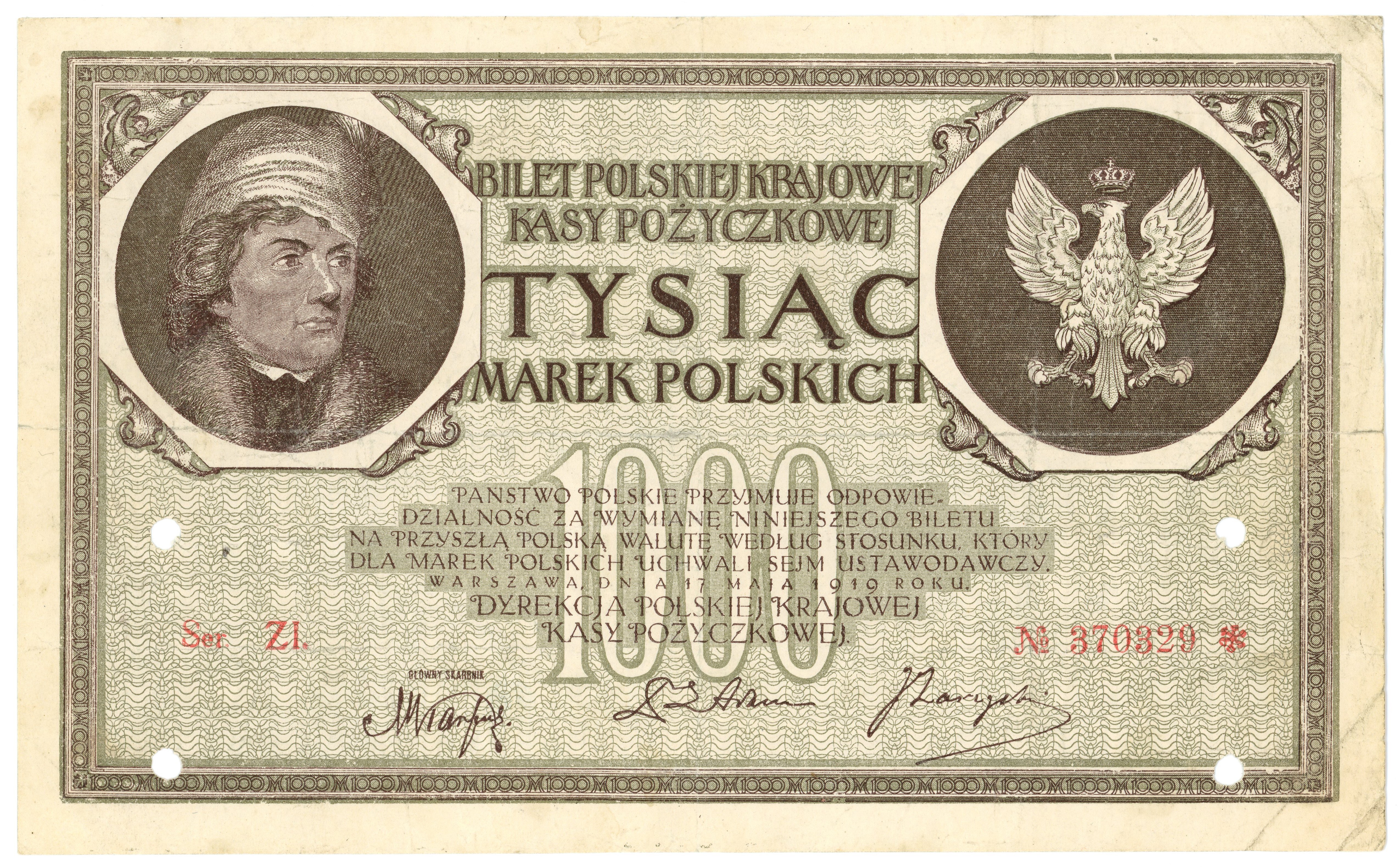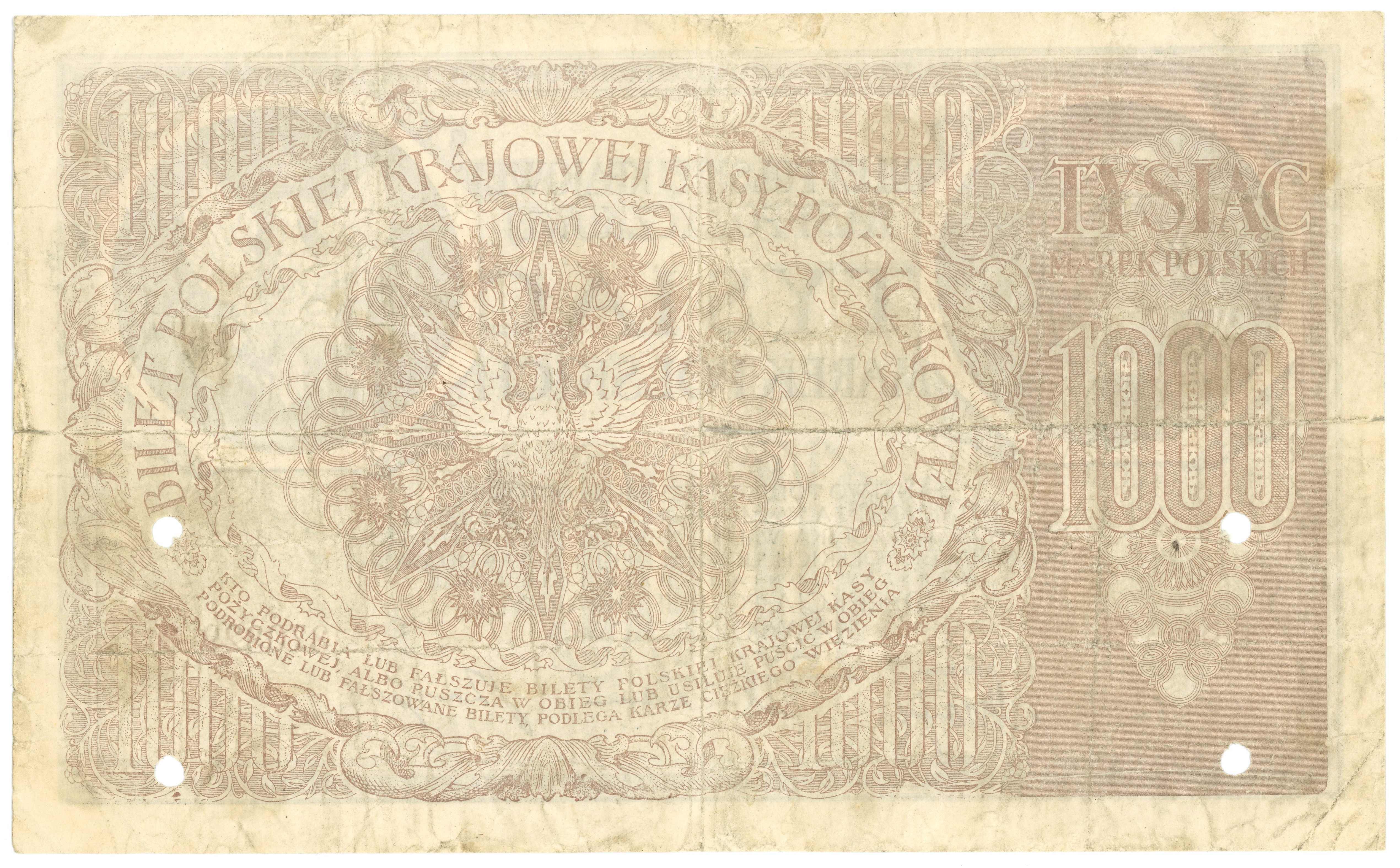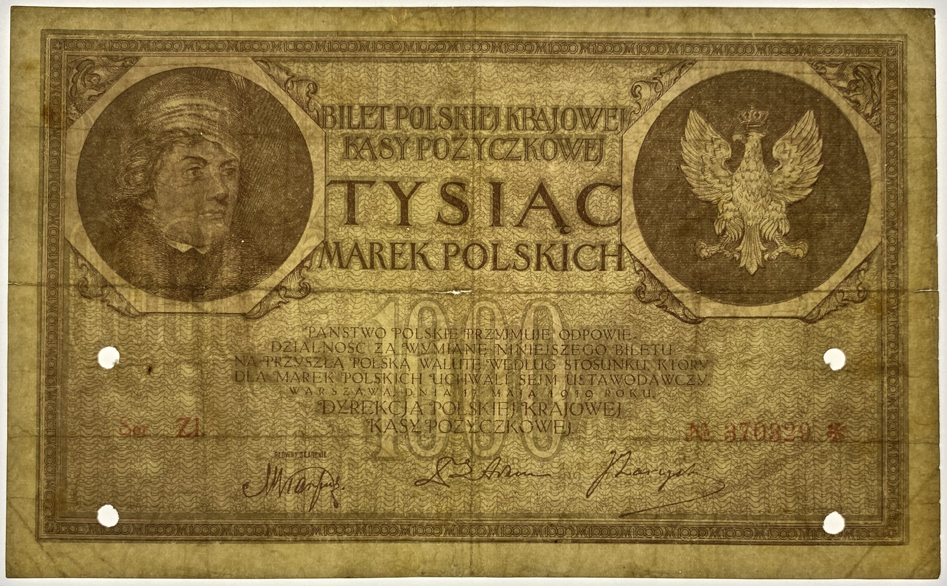 Banknot perforowany czterema dziurkami.