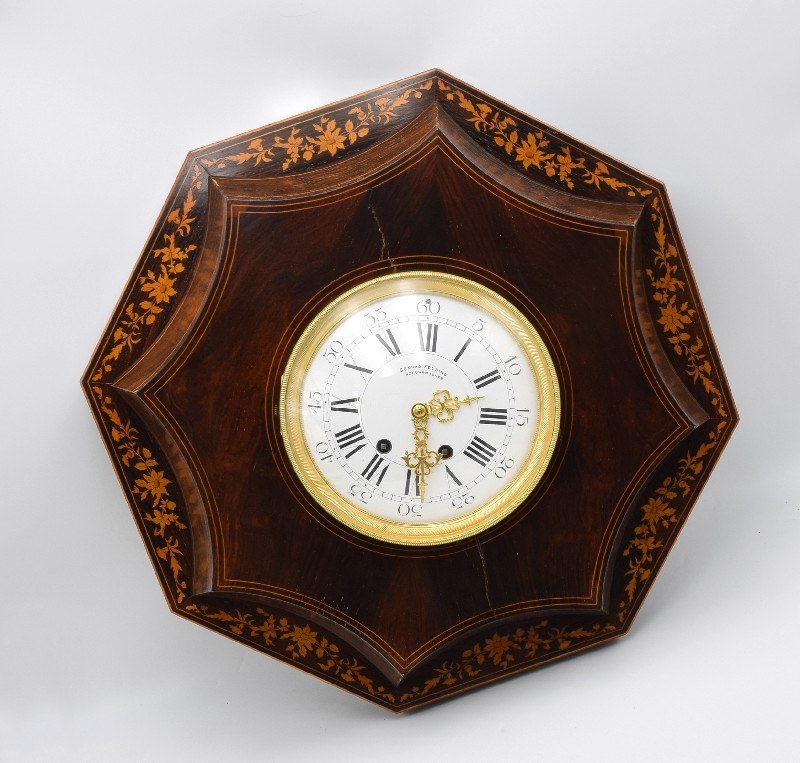 Obudowa ośmioboczna, drewniana, dekorowana wokół krawędzi intarsją w formie kwiatowych girland; tarcza biało emaliowana, z podziałem godzinowym rzymskim i minutowym arabskim, opasana moletowanym pierścieniem z brązu, z motywem sznura; wskazówki z brązu złoconego, ażurowe, z motywem akantu. Na tarczy napis: „CONRAD FELSING / HOFUHRMACHER / BERLIN”. Rodzina zegarmistrzowska przybyła do Berlina ze Schwarzwaldu; nazwisko pierwotnie brzmiało „Völtzing”. Stan zachowania: pęknięcie drewnianej obudowy. W załączeniu 2 kluczyki.