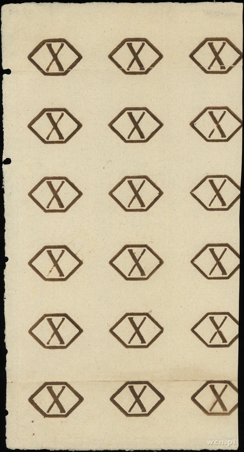 Insurekcja Kościuszkowska 1794, fragment papieru ze znakiem zabezpieczającym do druku 18 banknotów 10 groszy miedziane 13.08.1794, 6 x 3 sztuki; ze znakiem wodnym - Pogonią litewską i fragmentem napisu JEZ[IORNA], format 370x201 mm; Lucow 41 (R8) - ilustrowany w katalogu kolekcji, Miłczak - patrz A9; wielka rzadkość w bardzo ładnym stanie zachowania