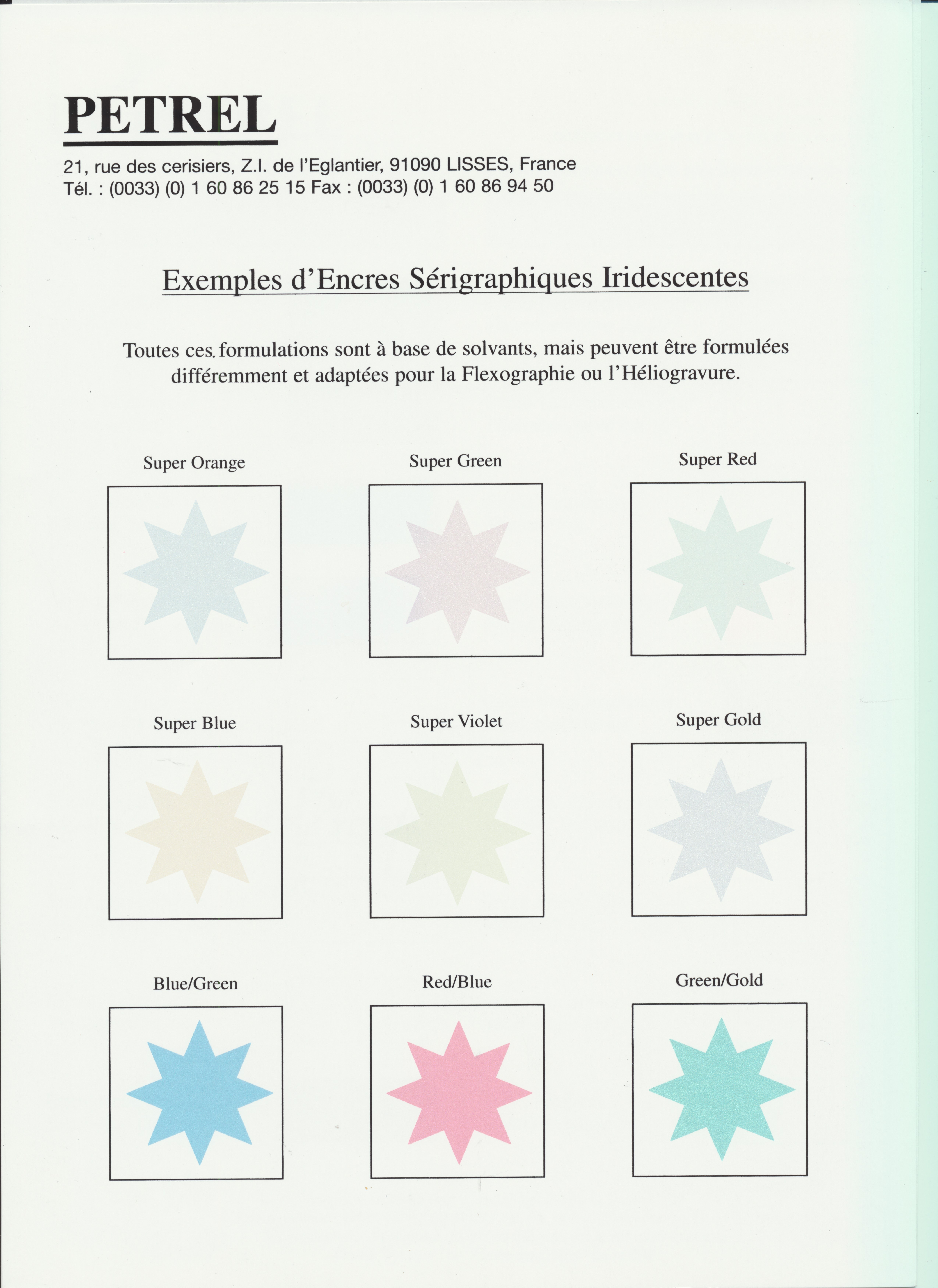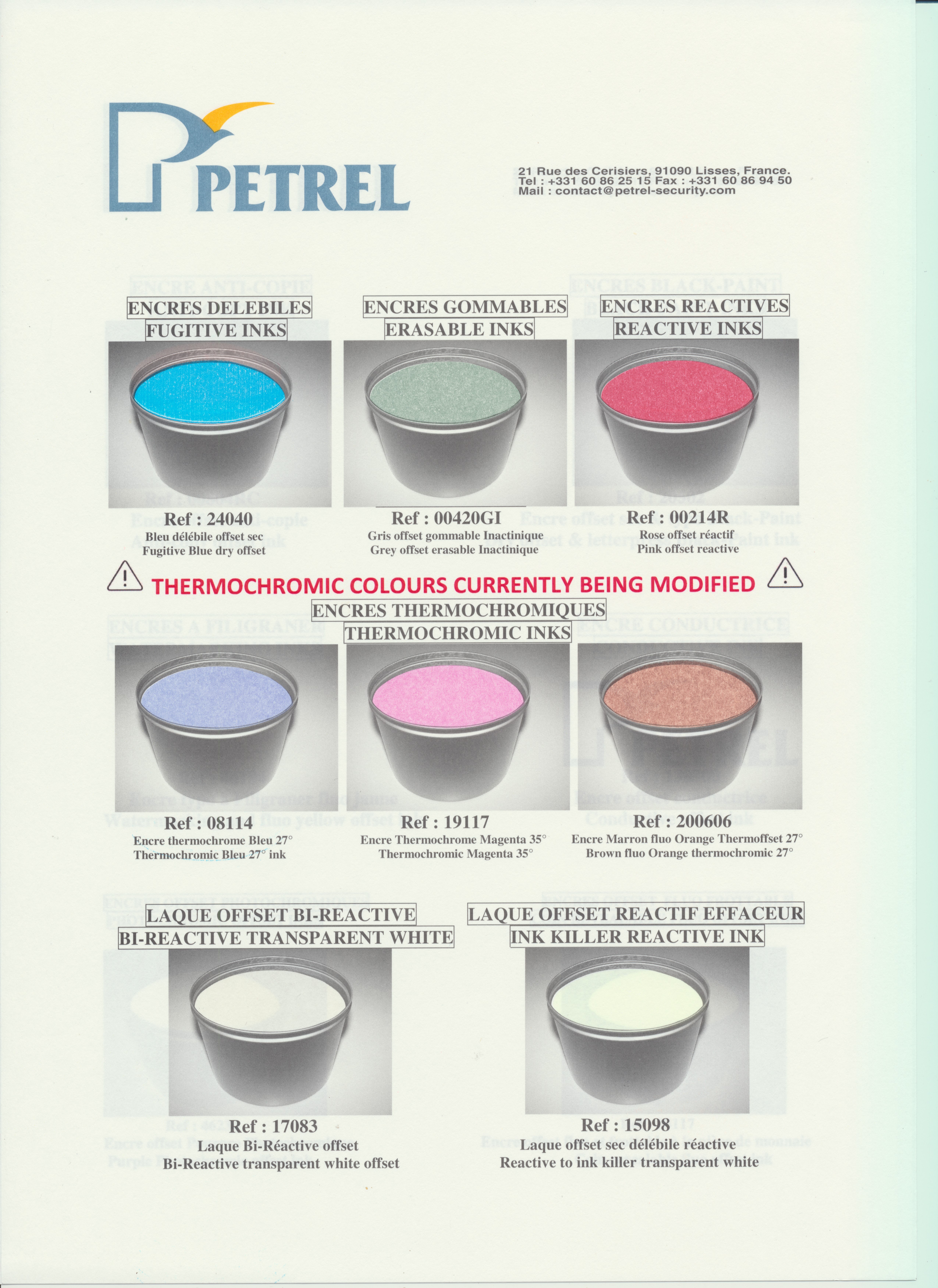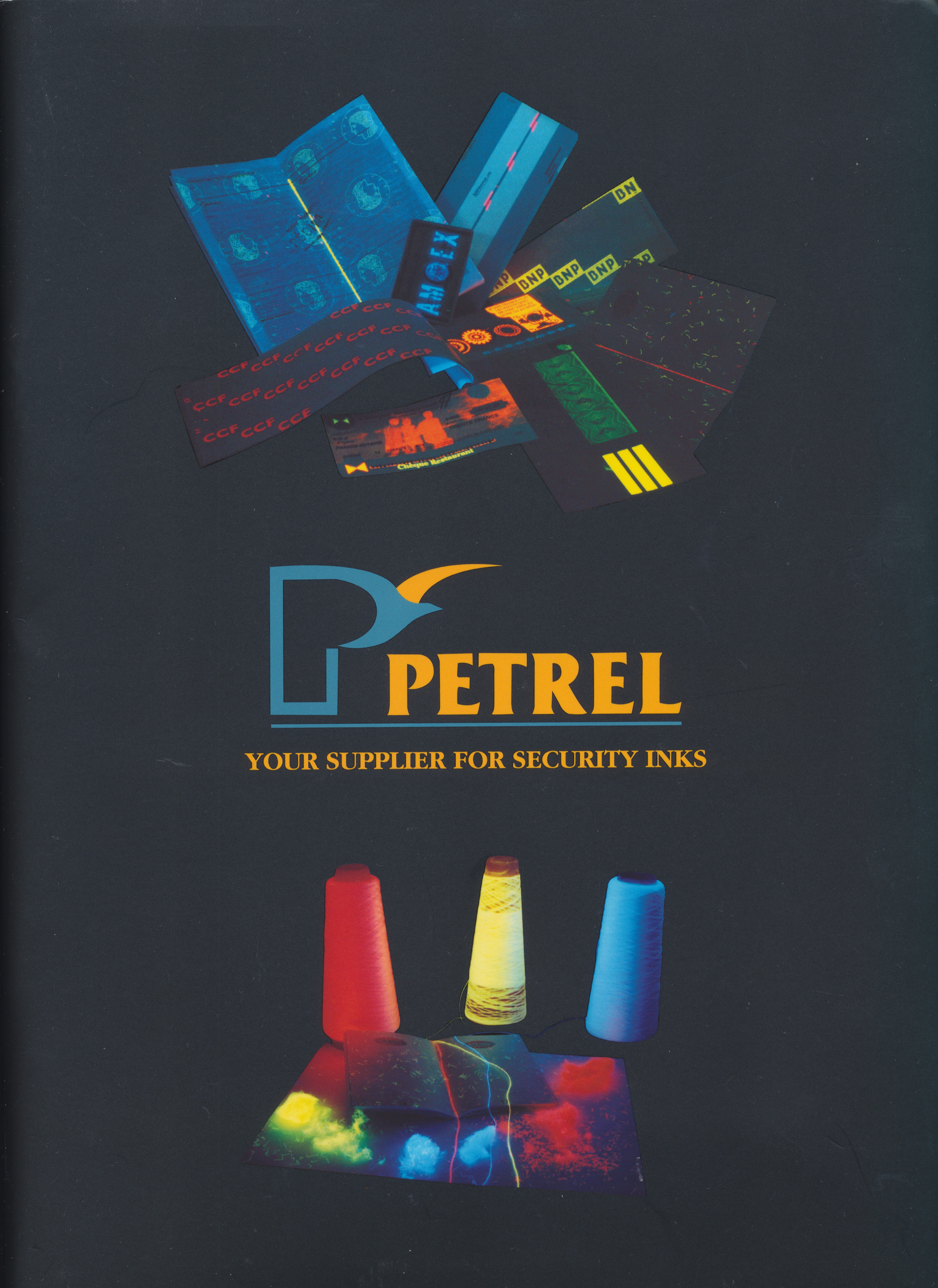 Folder firmy PETREL, producenta specjalnych farb wykorzystywanych do zabezpieczeń banknotów, druków wartościowych, dokumentów tożsamości. Zawiera szczegółowy opis różnego rodzaju farb, m.in. widocznych w UV/IR, termoaktywnych, fotochromatycznych, półprzezroczystych, reaktywnych chemicznie, irydyscentnych, do offsetu i sitodruku wraz z 14 kartami zadrukowanymi tymi farbami jako ilustracje. Rzadkość