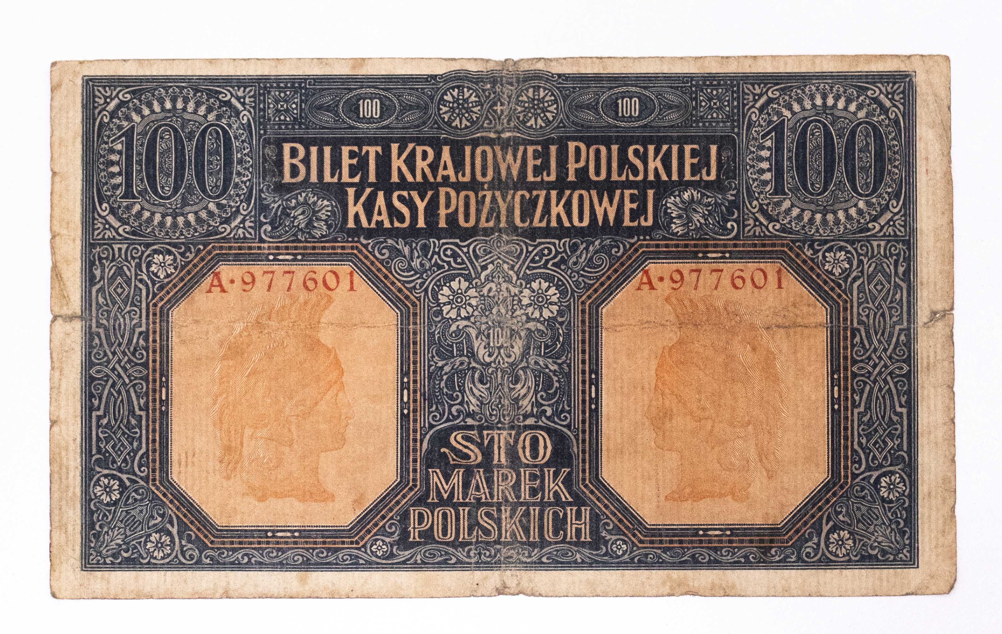 Banknot z długiego obiegu, naddarcia przy marginesach. Seria A 977601. Odmiana z numeracją sześciocyfrową. Rzadsza odmiana ... jenerał ...