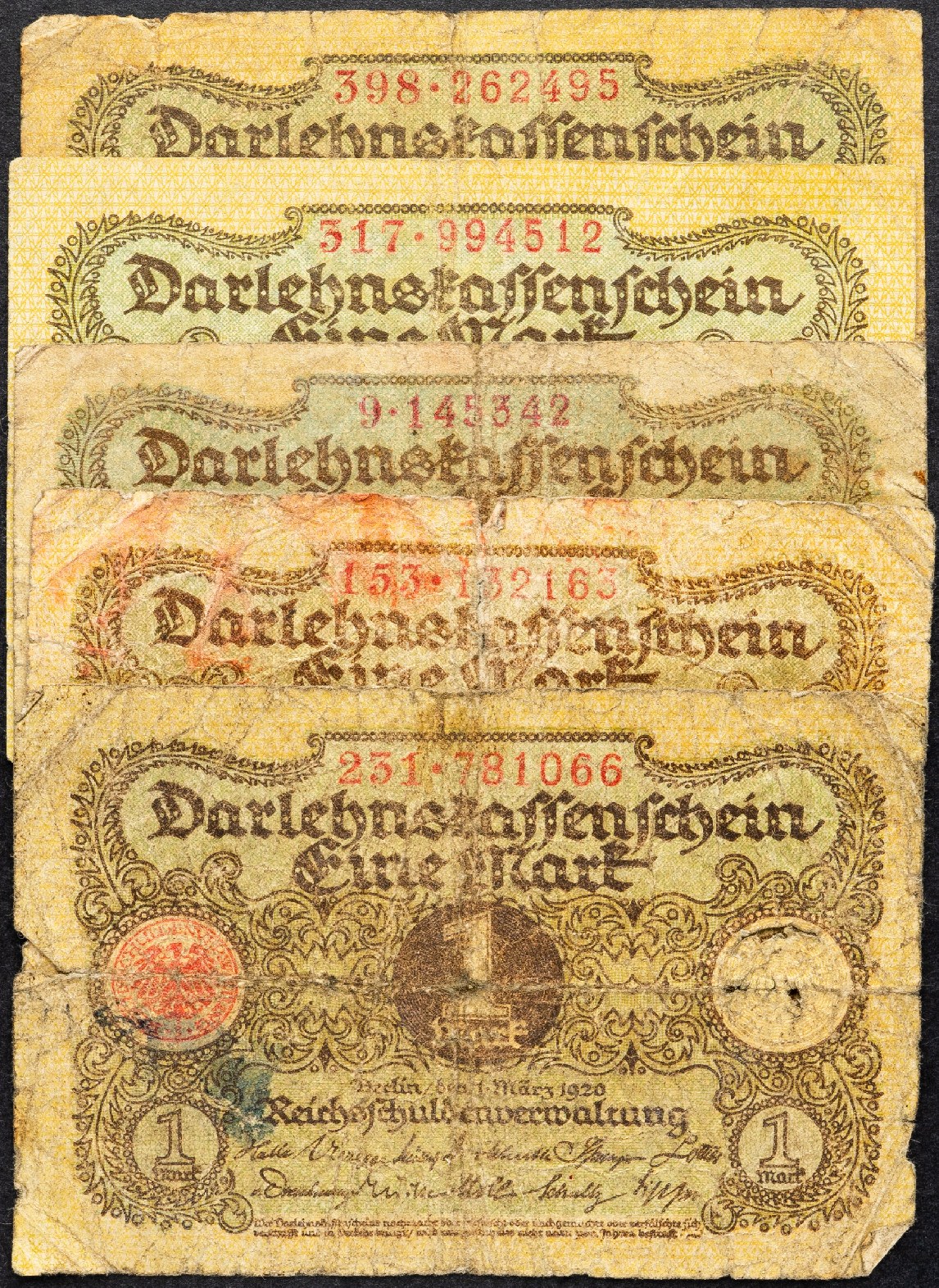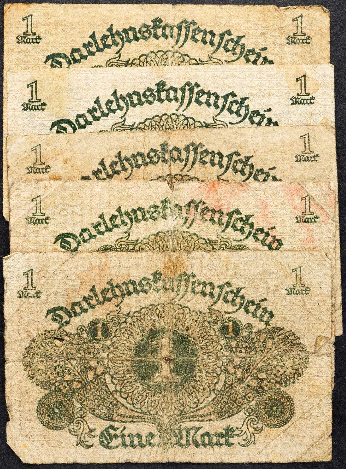 Germany, 1 Mark 1920, Lot of five banknotes; VG-G