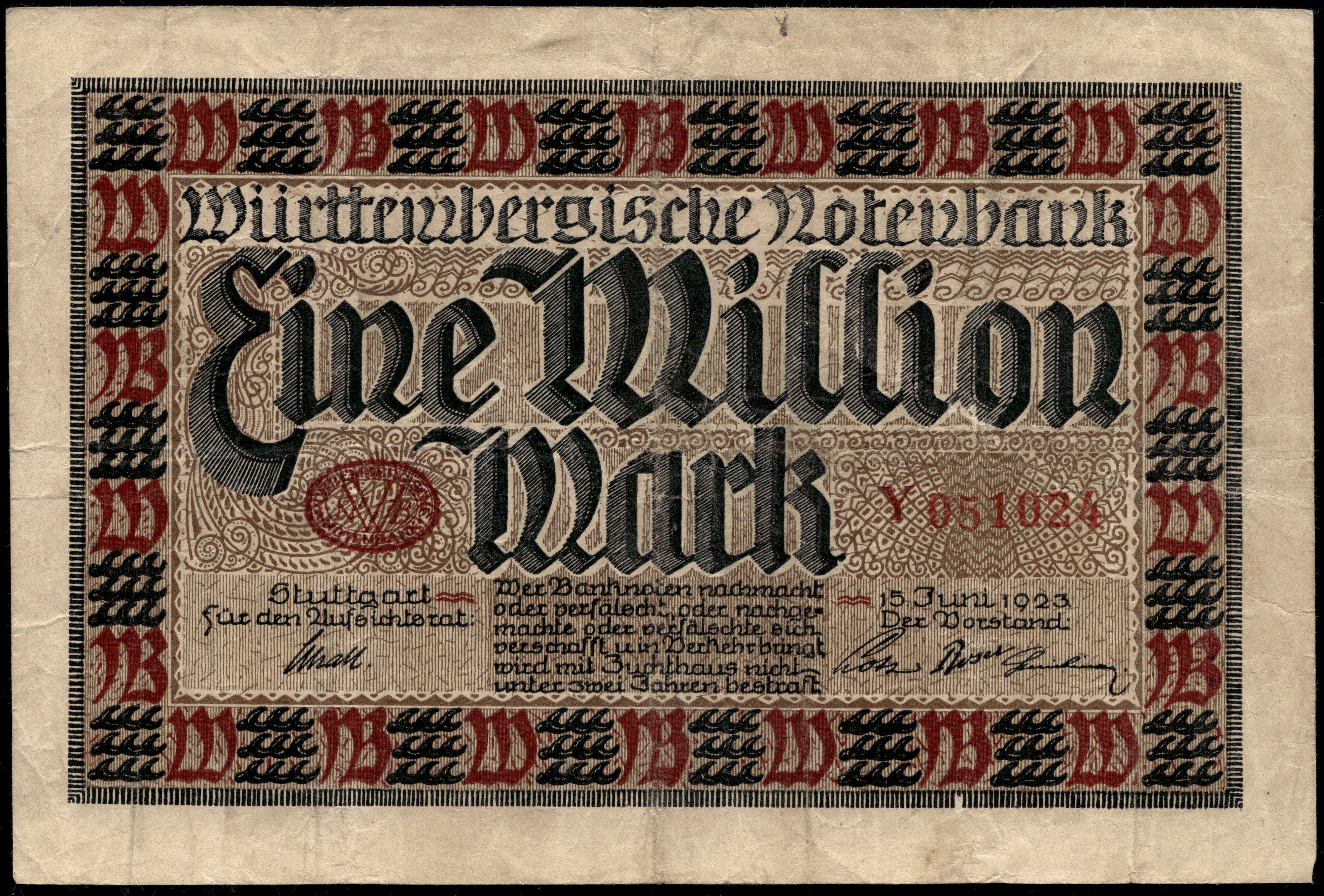 Germany. Wurttemberg 1 Million Mark 1923 Prefix Y