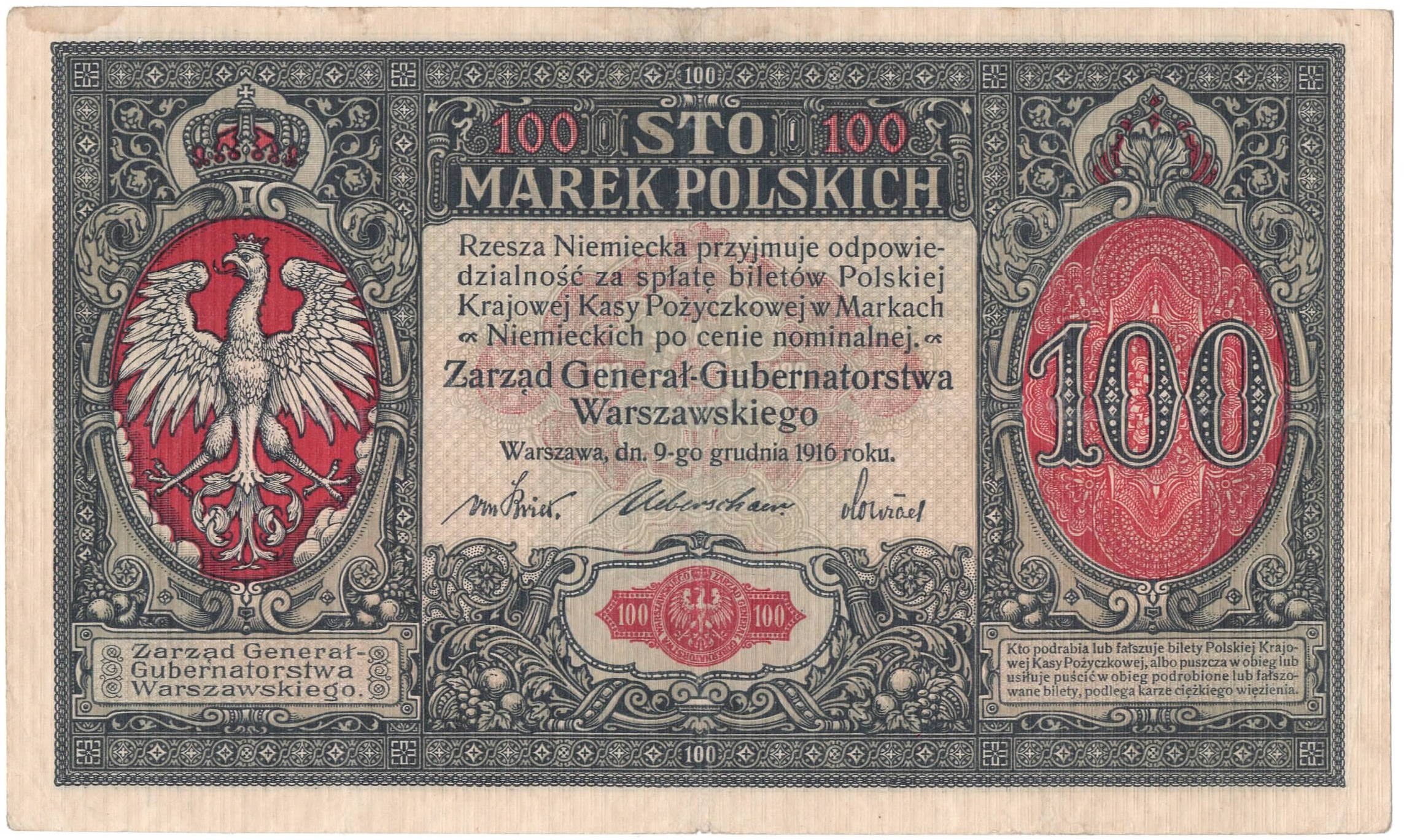 Banknoty Generalnego Gubernatorstwa wprowadzono do obiegu 26 kwietnia 1917, za emisję ich odpowiadała Polska Krajowa Kasa Pożyczkowa.
