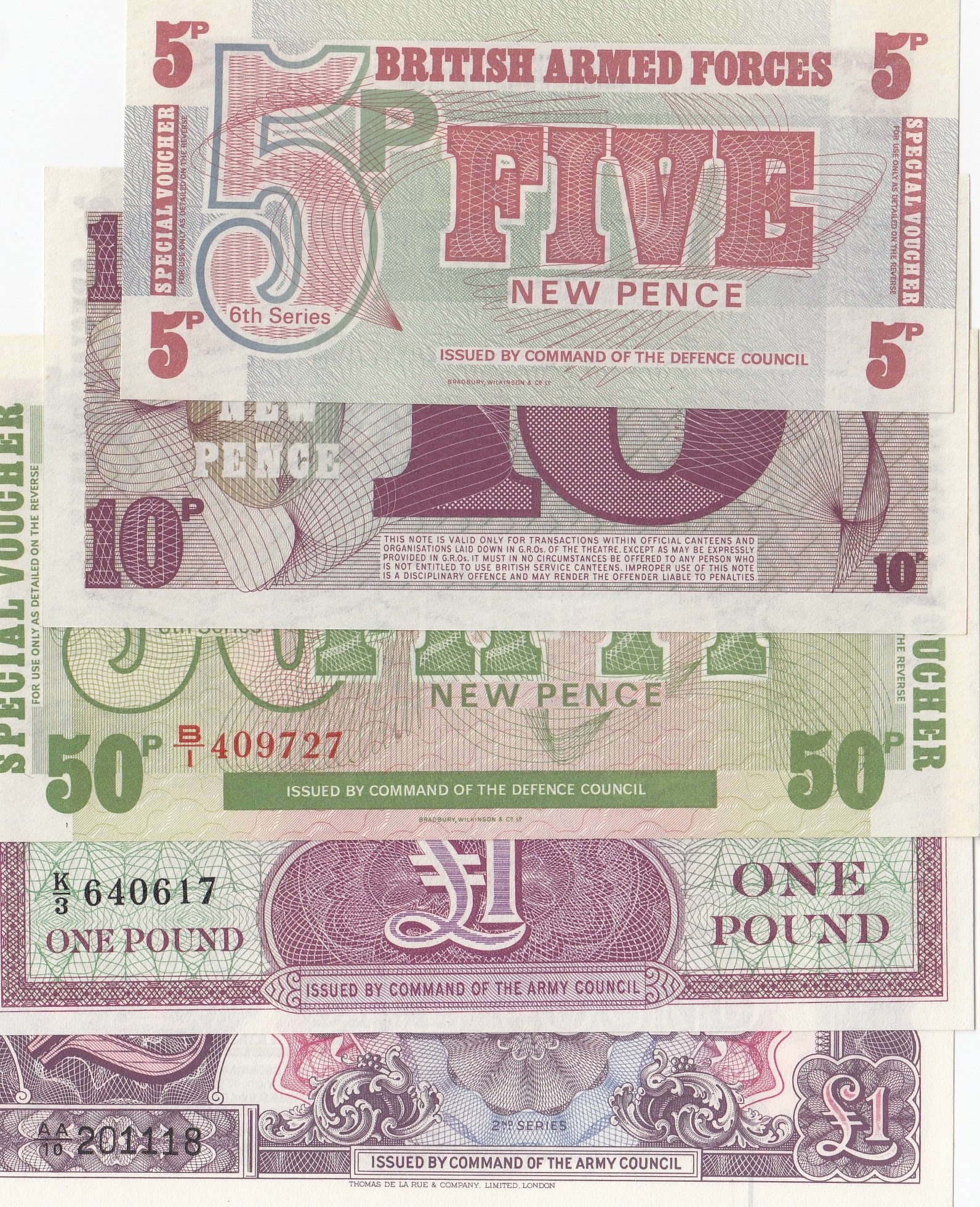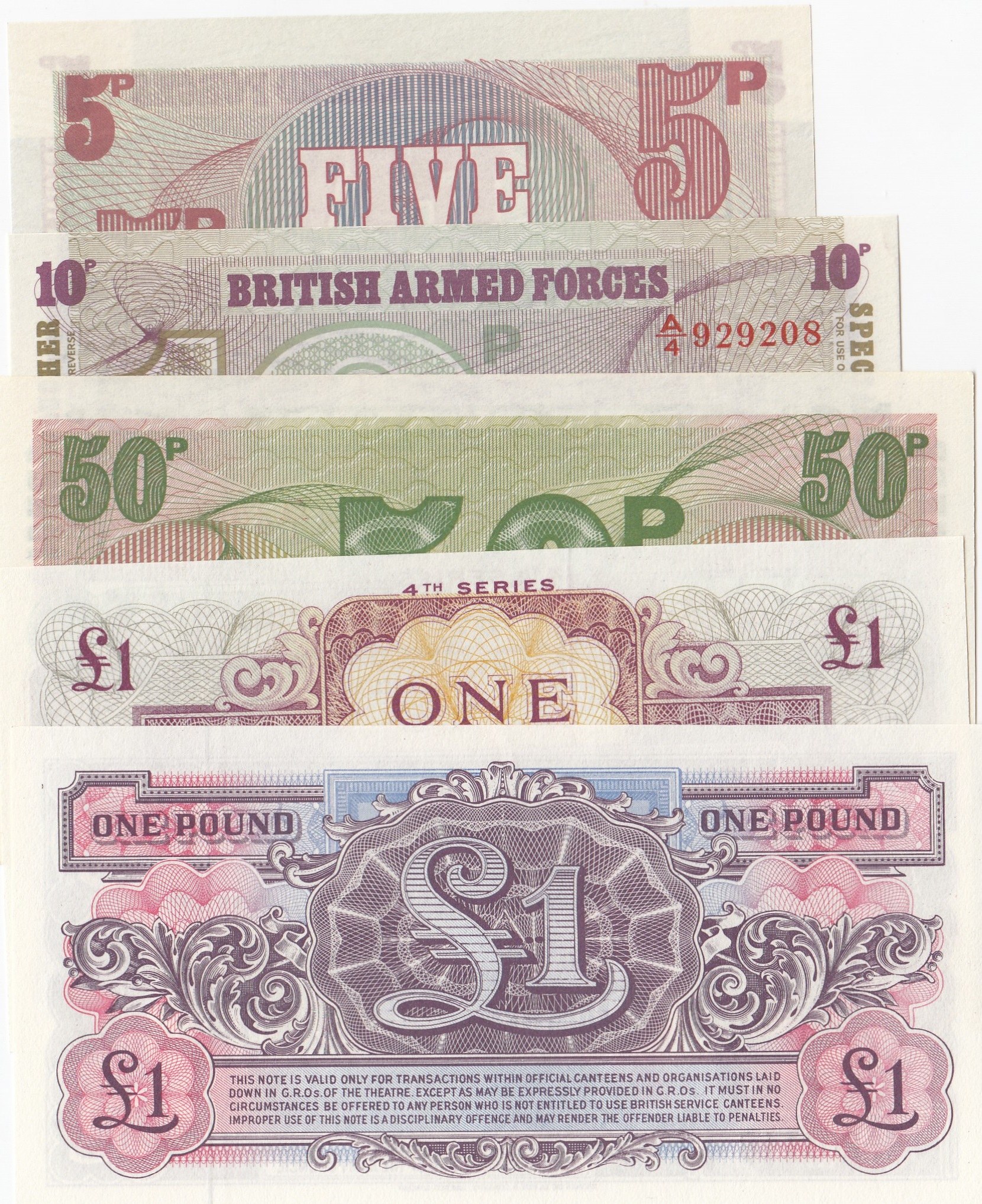 Great Britain, 5 Pence, 10 Pence, 50 Pence and 1 Pound (2), 1962, UNC, (Total 5 banknotes)