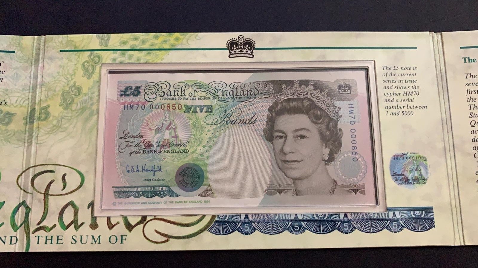 serial number: HM70 000850, Queen's 70th birthday commemorative issue 5 Pounds banknote and coin