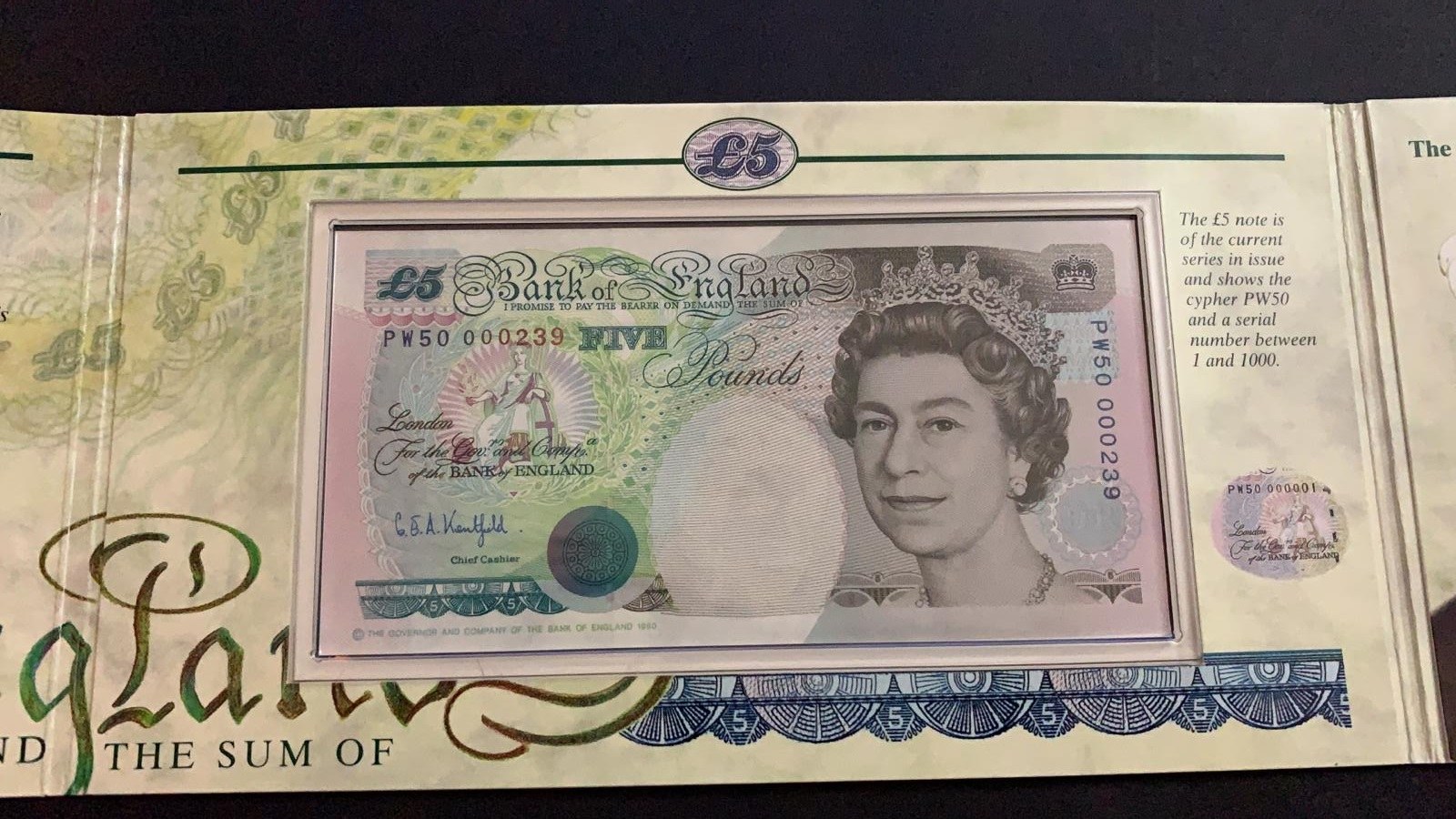 serial number: PW50 000239, Prens of Wales Crown 50th birthday commemorative Issue 5 Pounds banknote and coin