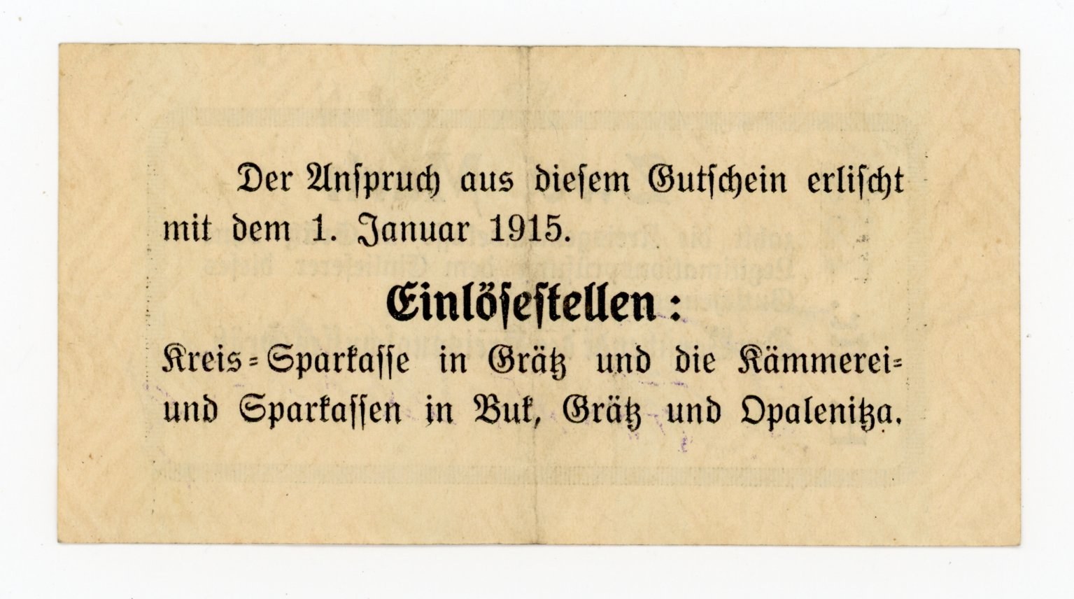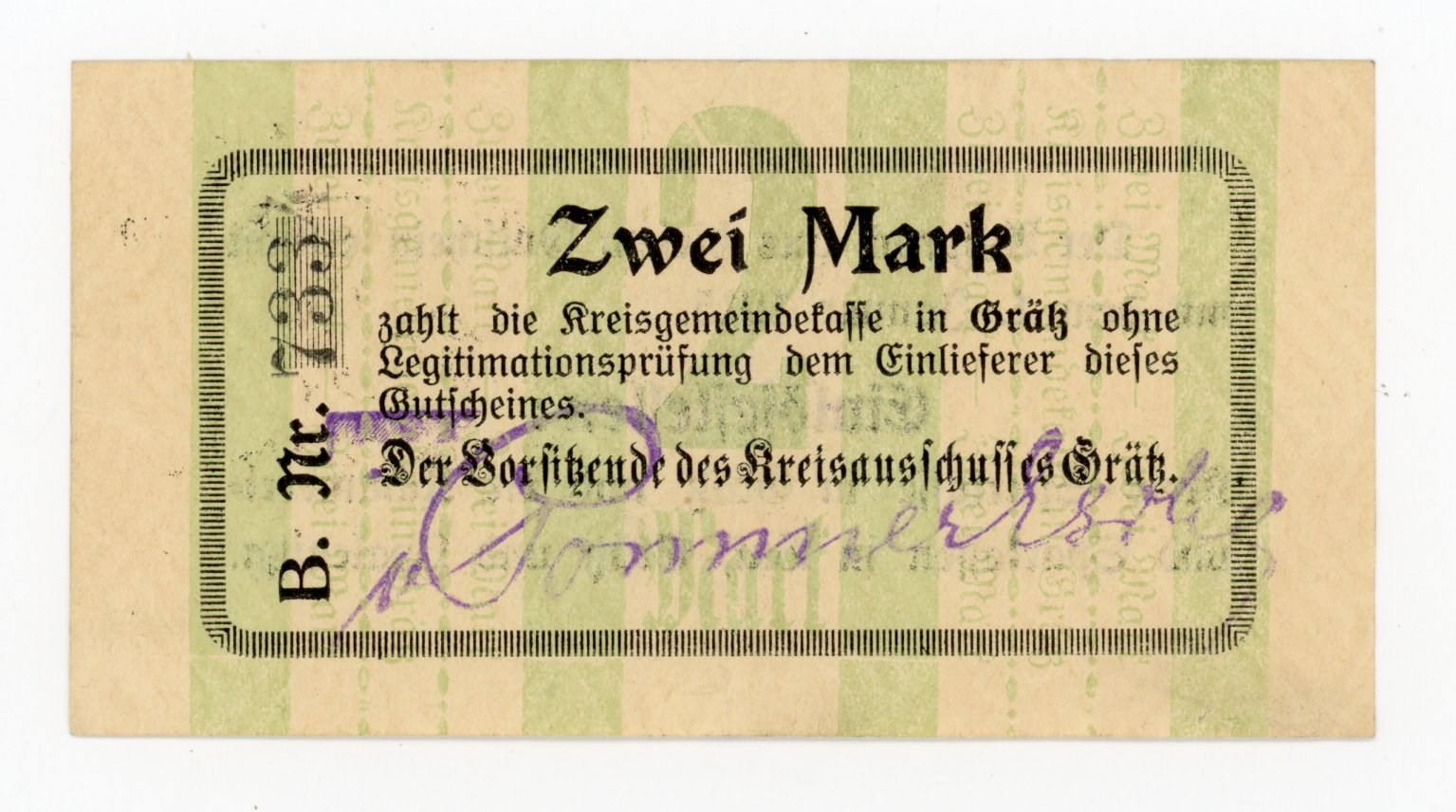 Grodzisk Wlkp./Grätz, 2 marki 1914. Stan zachowania: 2. Pionowo złamane. Literatura: Podczaski P-041/B/3 d)