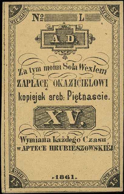 XIX-wieczne bony dominialne i zastępcze, Hrubieszów, Apteka Hrubieszowska, 5 kopiejek srebrem 1861, z numeracja i podpisem oraz 15 kopiejek srebrem 1861, druk nie wypełniony /blanko/, Jabł. 306 i 307, łącznie 2 sztuki